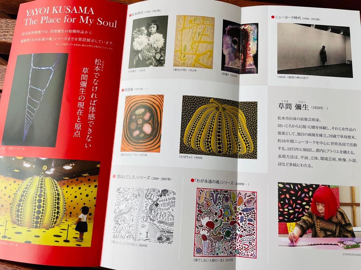 На третьем этаже музея открыта обновленная экспозиция всемерно известной художницы Кусама Яёи, рожденной в Мацумото. Её необычные работы можно увидеть в музеях разных стран. Родному городу художница подарила огромную композицию ярких цветов, установленных перед зданием музея.