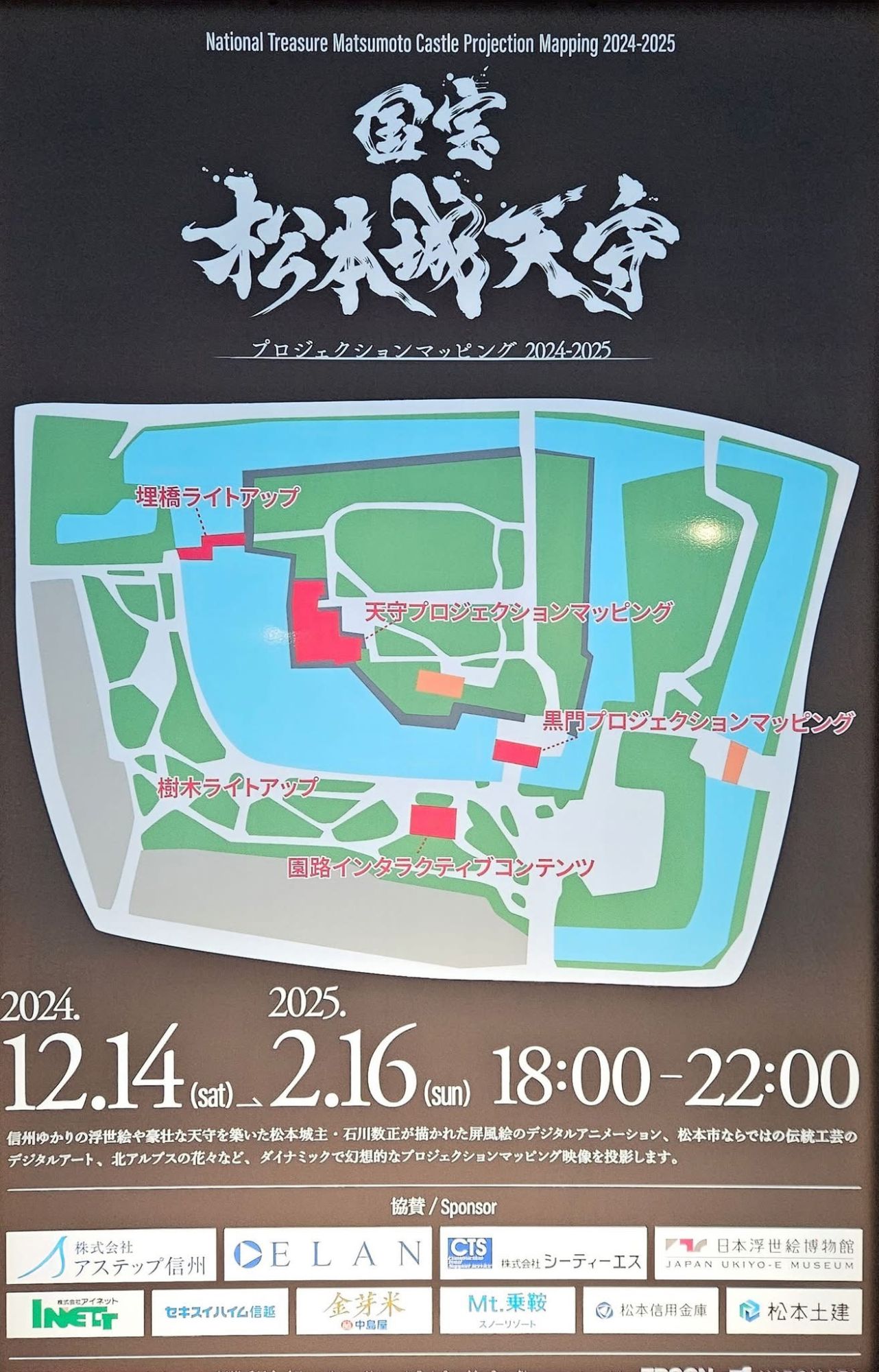 Традиционное лазерное шоу на стенах древнего замка Мацумото, ставшее любимым зимним событием для жителей и гостей города, началось 14 декабря 2024 года и продлится до 16 февраля 2025 года. Каждый вечер с 18:00 до 22:00 замок превращается в яркий арт-объект, привлекая множество зрителей.
