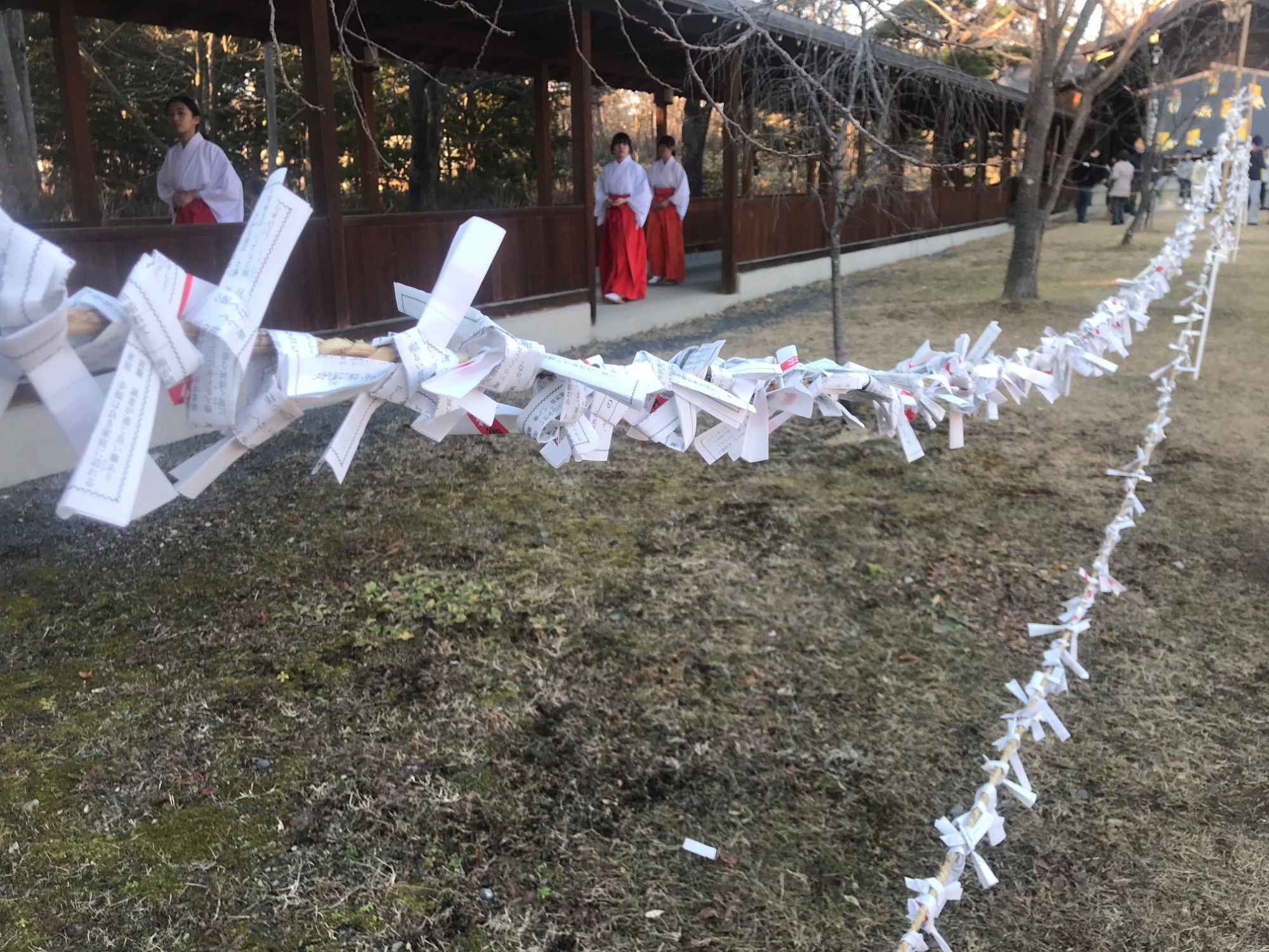 Желающие получить предсказание на год платят 300иен и вытягивают палочку с номерком из небольшой коробочки. После чего получают листок с предсказанием соответствующий выпавшему номеру. Если полученный прогноз на год не радужный , то листик сворачивают в жгут и привязывают к специальным ограждениям на территории храма.