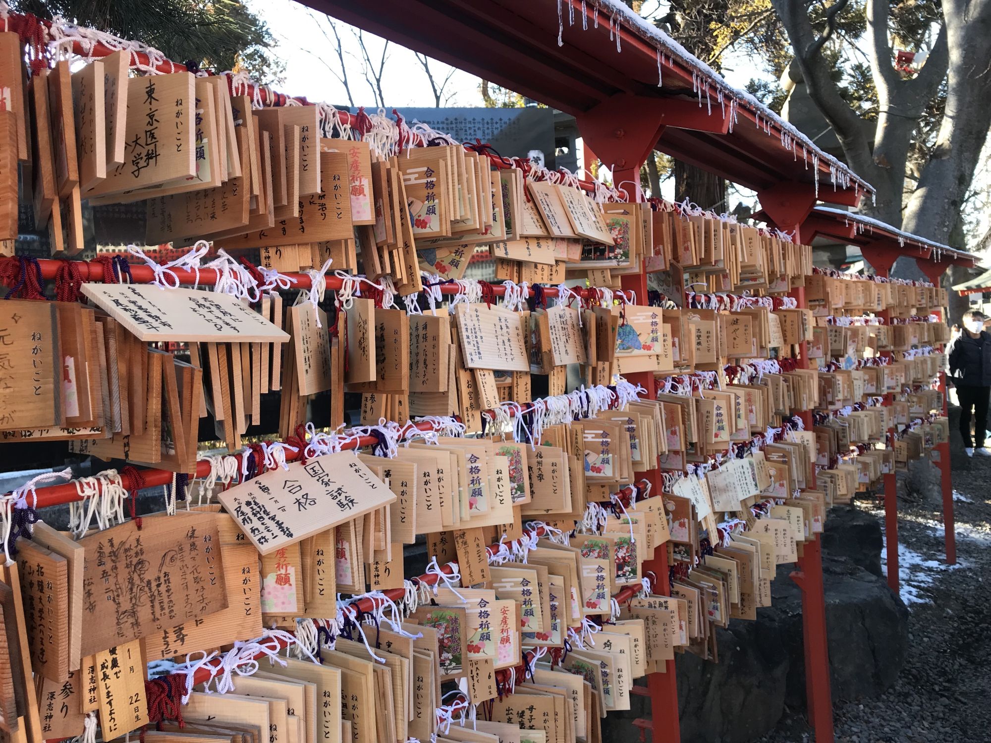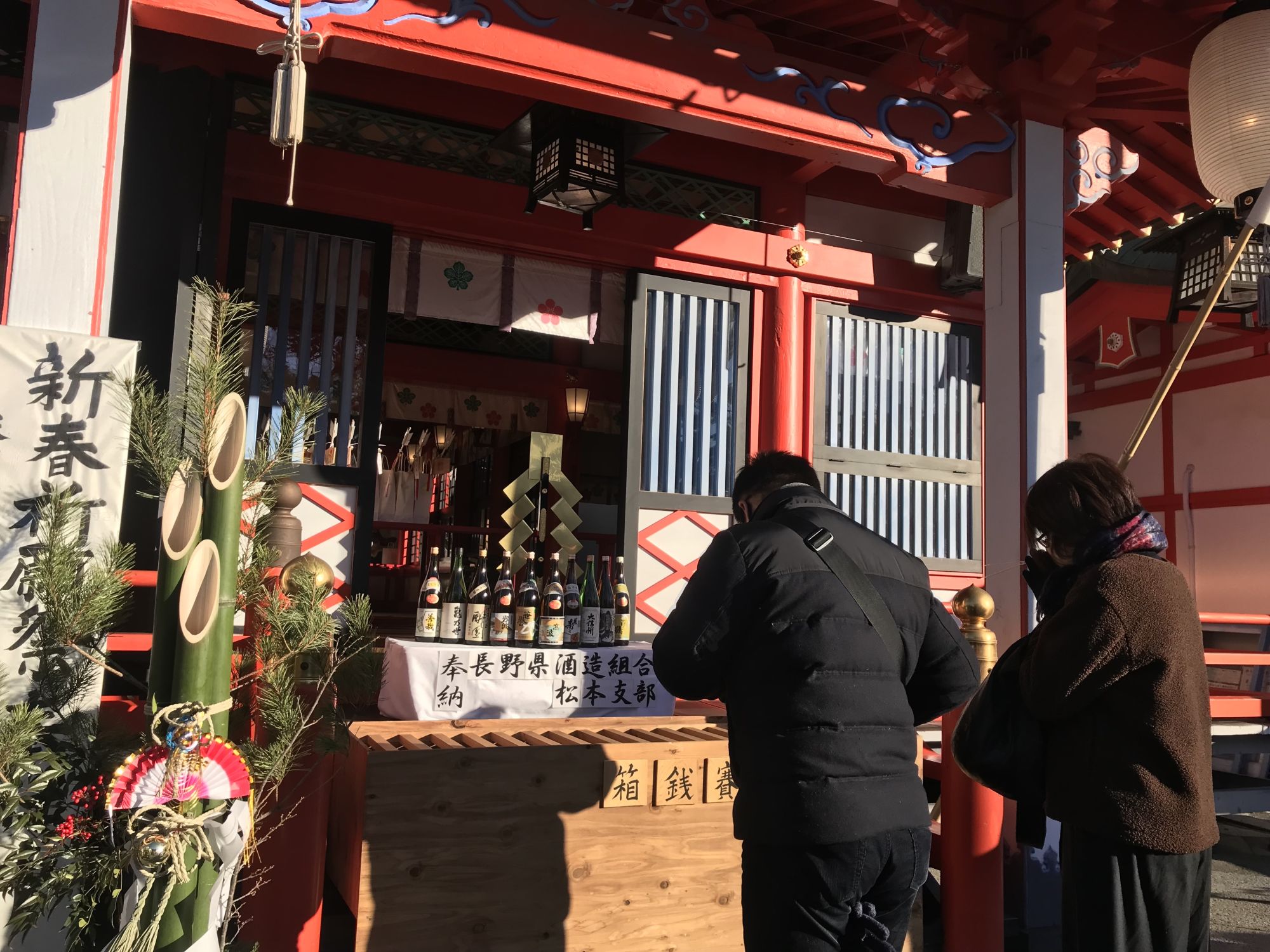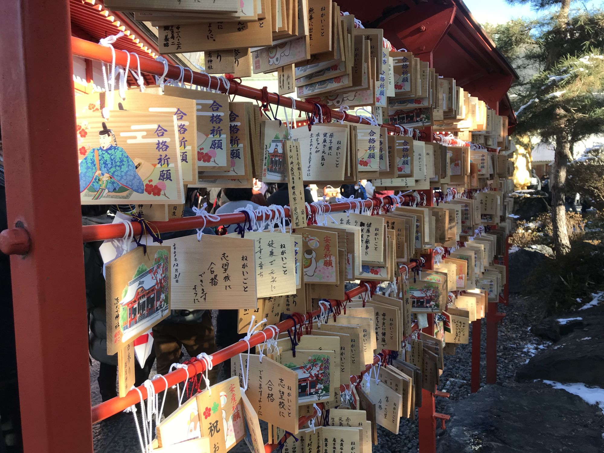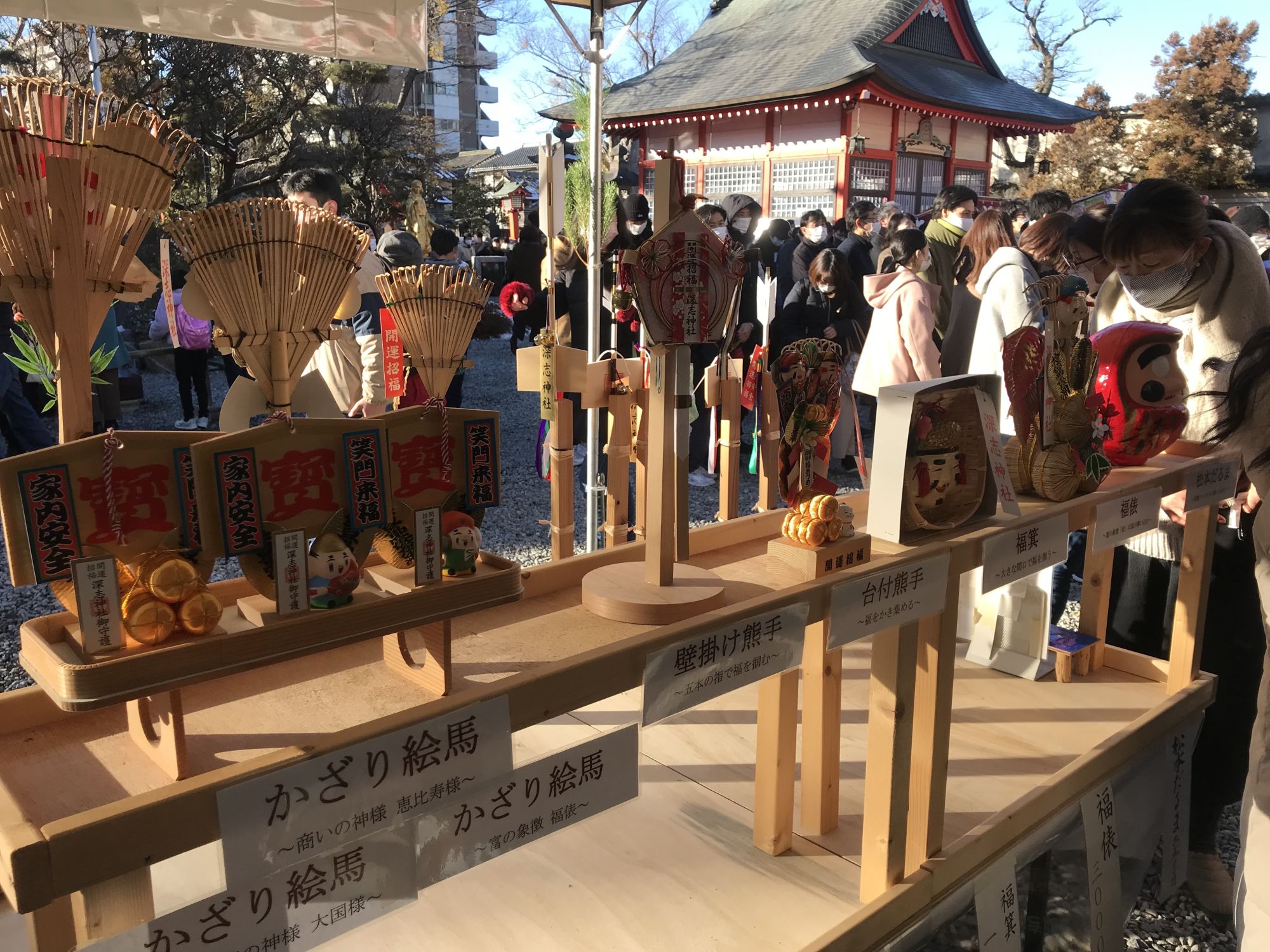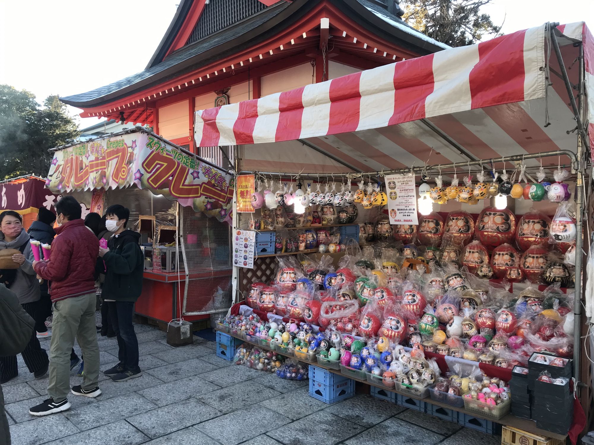 На территории храма, как обычно в новогодние дни можно приобрести всевозможные обереги и талисманы, а так же исполнителя желаний —  дарума.