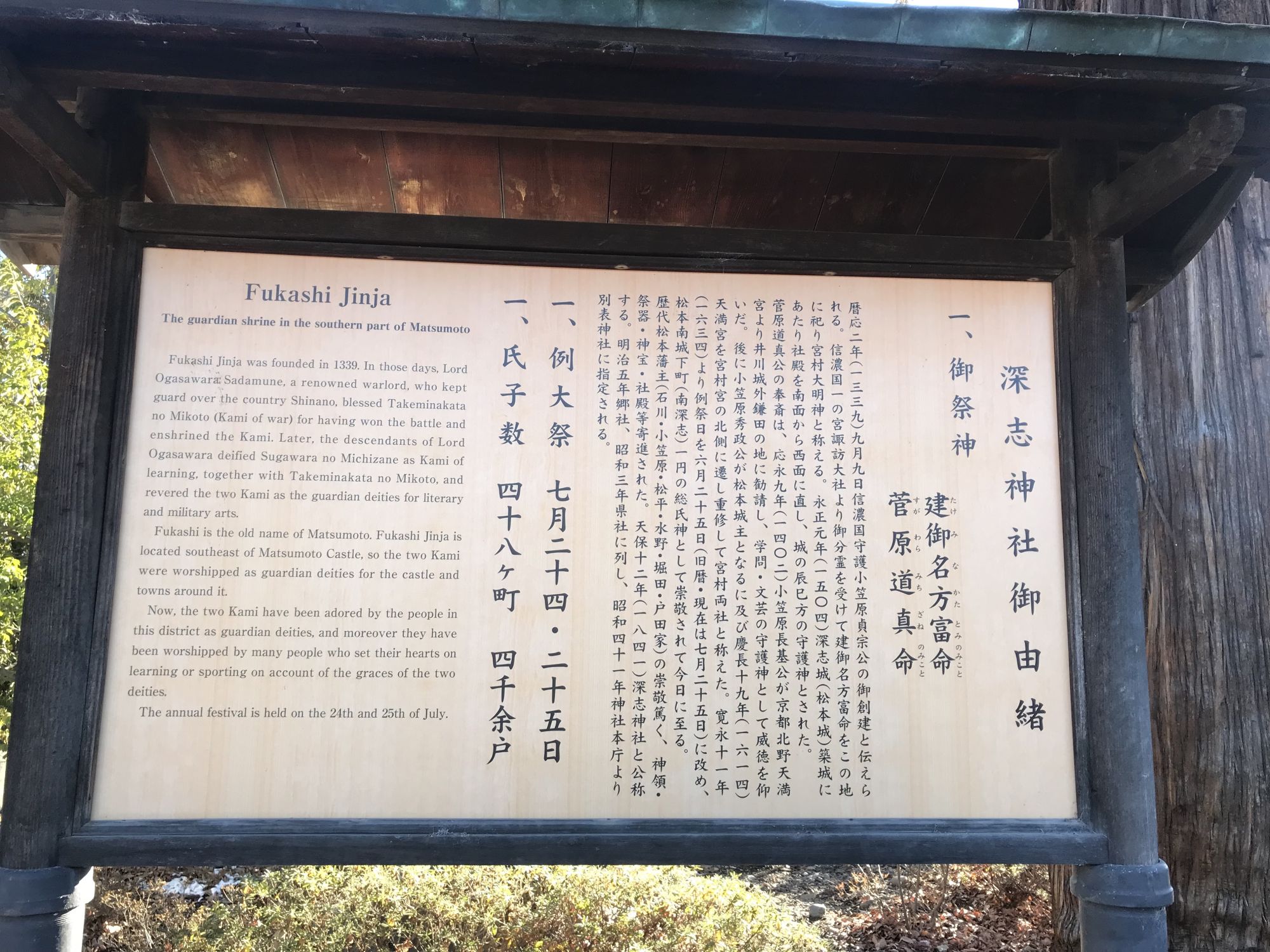 Храм Фукаси несомненно является достопримечательностью города и входит в путеводители по Мацумото. Здесь рады гостям, для иностранных туристов есть стенд и интерактивная доска на английском языке.