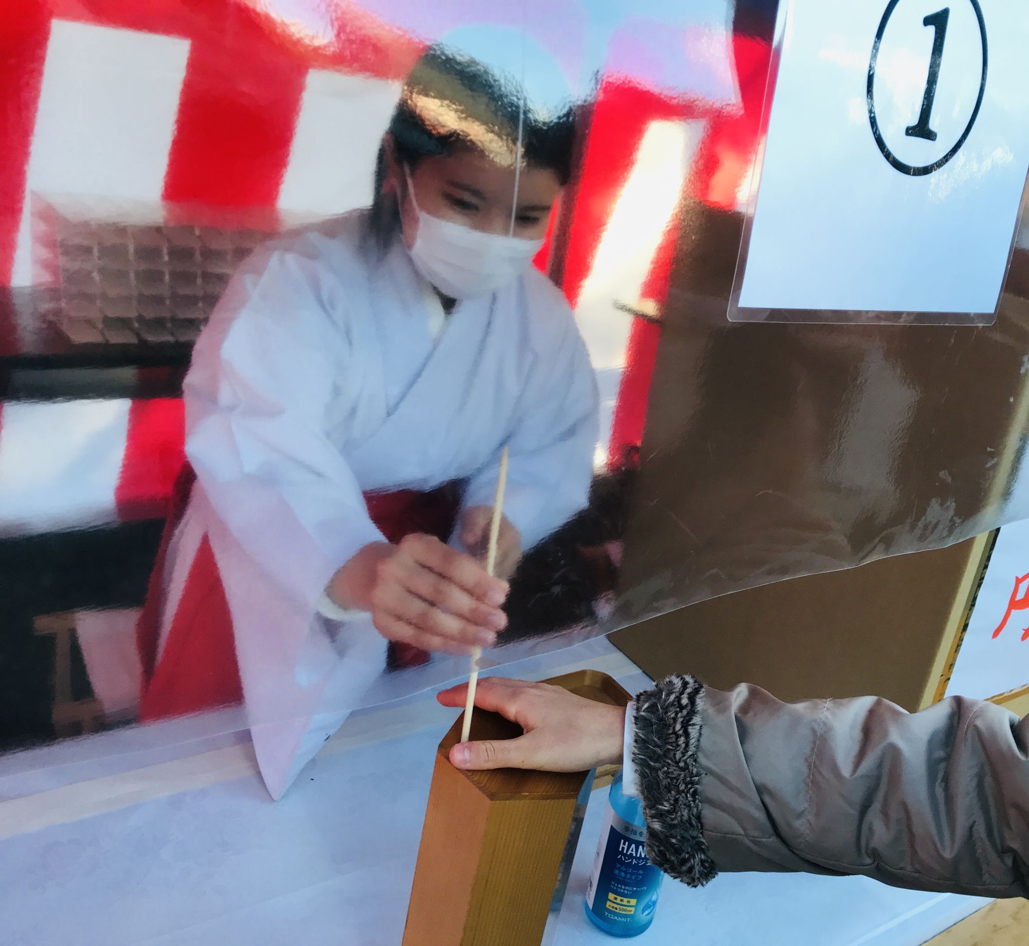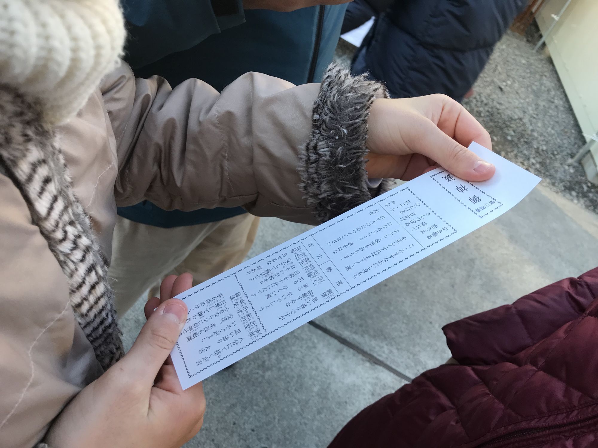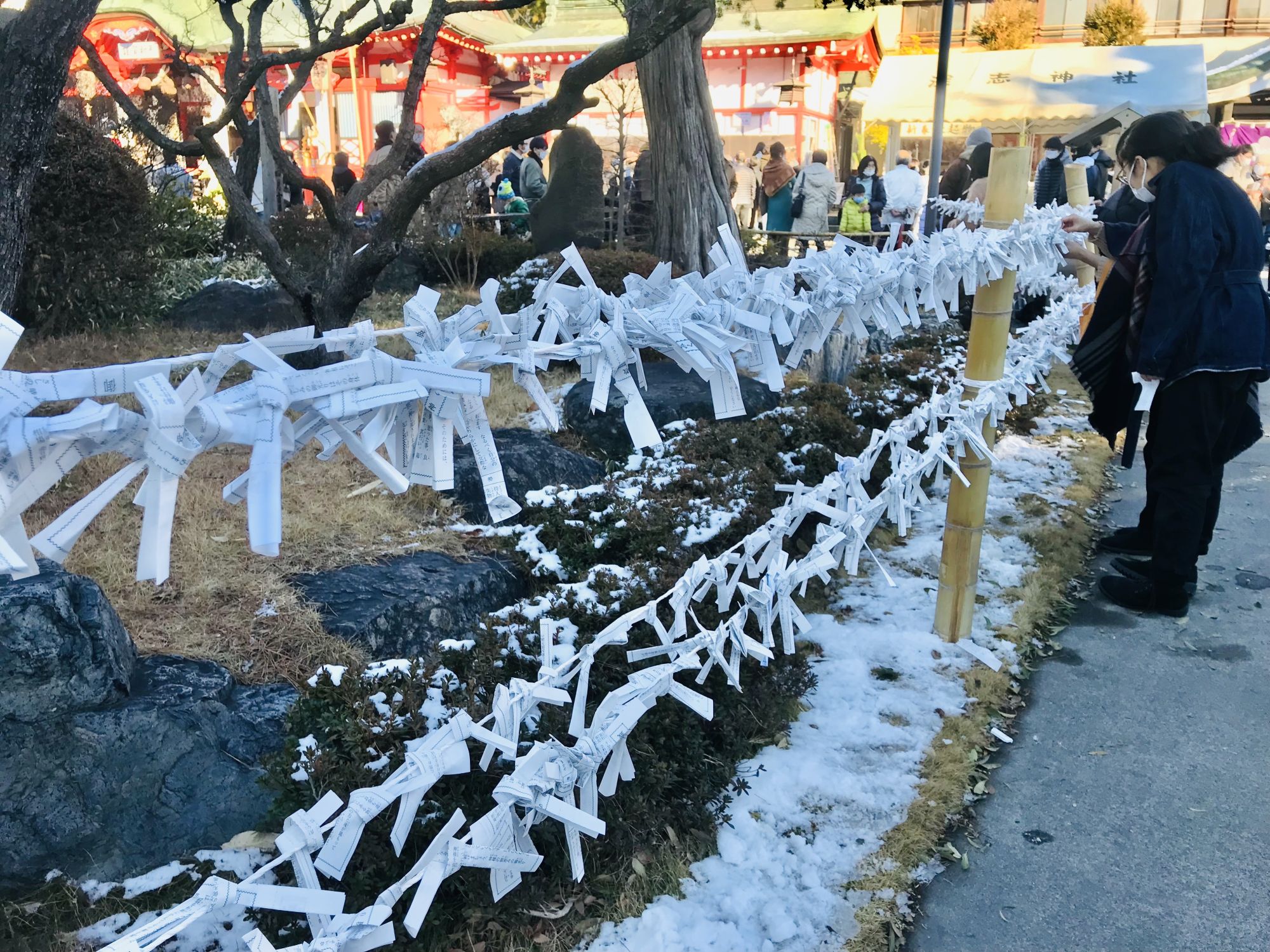 Считается, что в первые дни гадания наиболее точны, поэтому у палаток с микуджи (предсказаниями) толпится народ. За сто иен из деревянного ящичка нужно вытянуть палочку с номером, в соотвествии с которым служительницы храма выдадут листок с предсказаниями на этот год. Удачные бумажки счастливчики уносят с собой, а те, что сулят беды — привязывают к специально ограде.