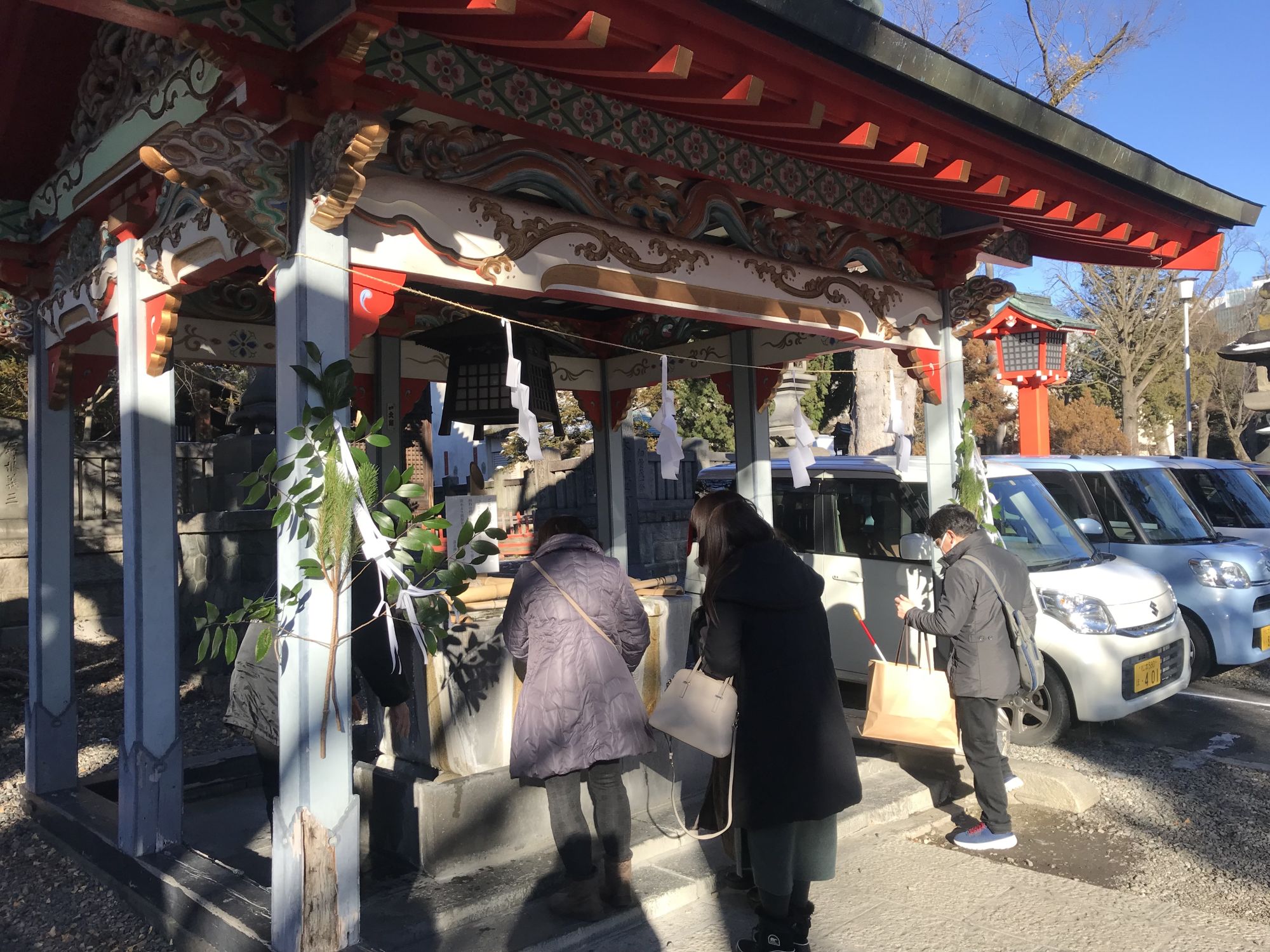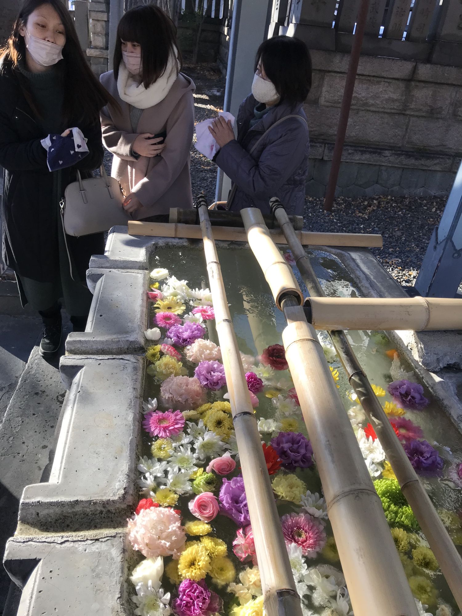 Из-за пандемии черпак убрали и для хацумоде украсили емкость с водой цветами.