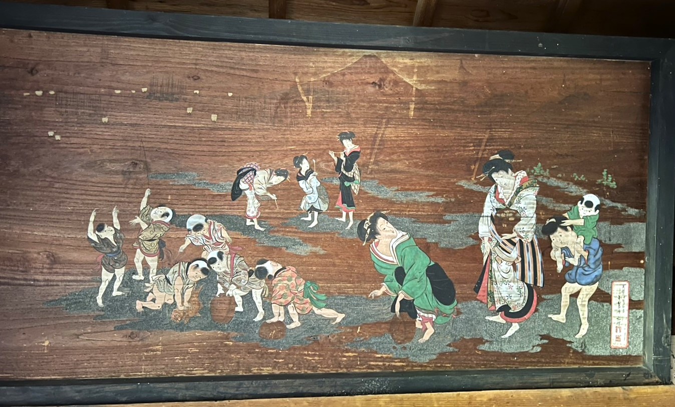 会田地区の会田神明宮(しんめいぐう)にある絵馬で、潮干狩りの様子が描かれています。縦77.0cm、横159.0cmと大きな絵馬で、杉板に彩色され、周囲を額装しています。