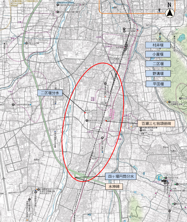 松本市芳川地区は、奈良井川と田川に挟まれているにもかかわらず地下用水に乏しく、集落が形成された時代から域内に用水路を巡らせてきました。奈良井川の河川敷の簡易堰から取水していましたが、用水路は大雨の度に流され、農業用水の安定供給が課題でした。その解決策として、幾多の困難を乗り越えて恒久堰(四ヶ堰)を築いたのが百瀬三七です。四ヶ堰用水は、その後も整備・改良が行われ、円筒分水はそのシンボルとなっています。