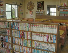 店内の本棚は 漫画がいっぱい。昼時は学生やサラリーマンでいっぱいになります。