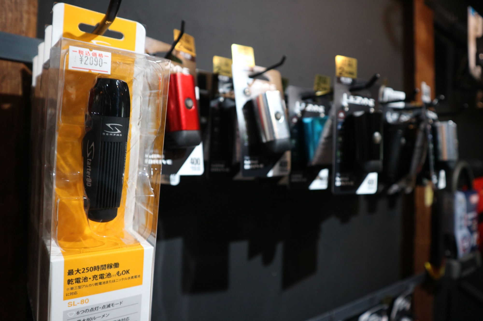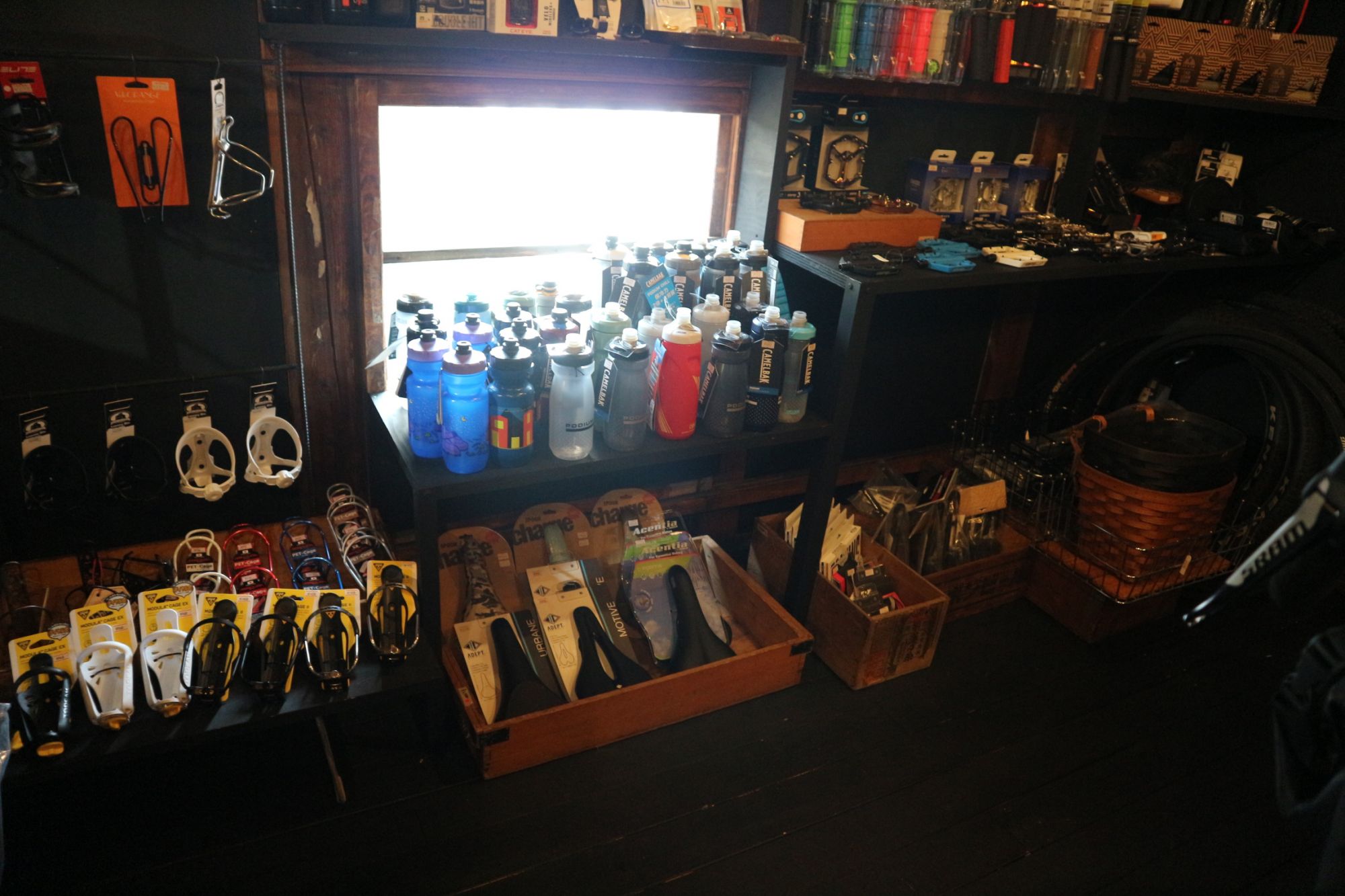自転車の小物も充実しています。オリジナルグッズや中古品もあります。
