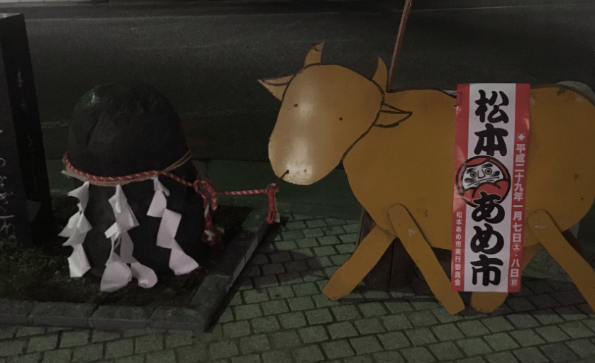 塩市(のちのあめ市)は、戦国時代、甲斐の武将・武田信玄による塩留めの際、越後の上杉謙信が塩を送ったという逸話に由来すると伝えられています。城下町・松本には、塩を運んだ牛をつないだとされる牛つなぎ石が残り、当時の物流や人々の暮らしを今に伝えています。この伝承を背景に始まった塩市は、時代とともに姿を変え、現在のあめ市へと受け継がれてきました。