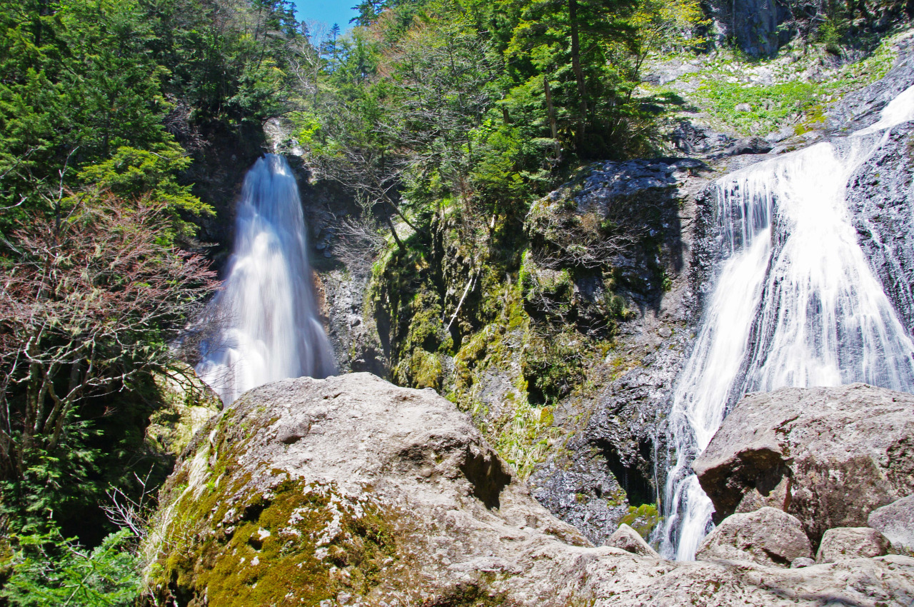 乗鞍岳の麓、標高約1,800mの森の中にある滝。水源の異なる三つの沢がこの場所で落ち込み、三本の滝を一度に望める珍しい景観が広がります。落差はそれぞれ約50~60mで、岩肌を流れ落ちる水の表情も三者三様。長野県の名勝で、日本の滝百選にも選ばれています。遊歩道を歩いて訪れる、乗鞍高原を代表する景勝地の一つです。
