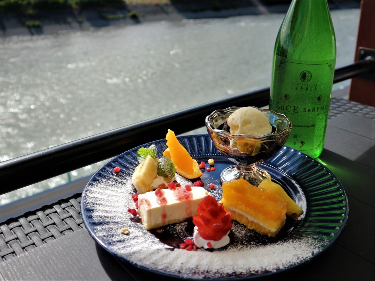 奈良井川に面したテラス席もあり、川と北アルプスの景観も楽しめます。