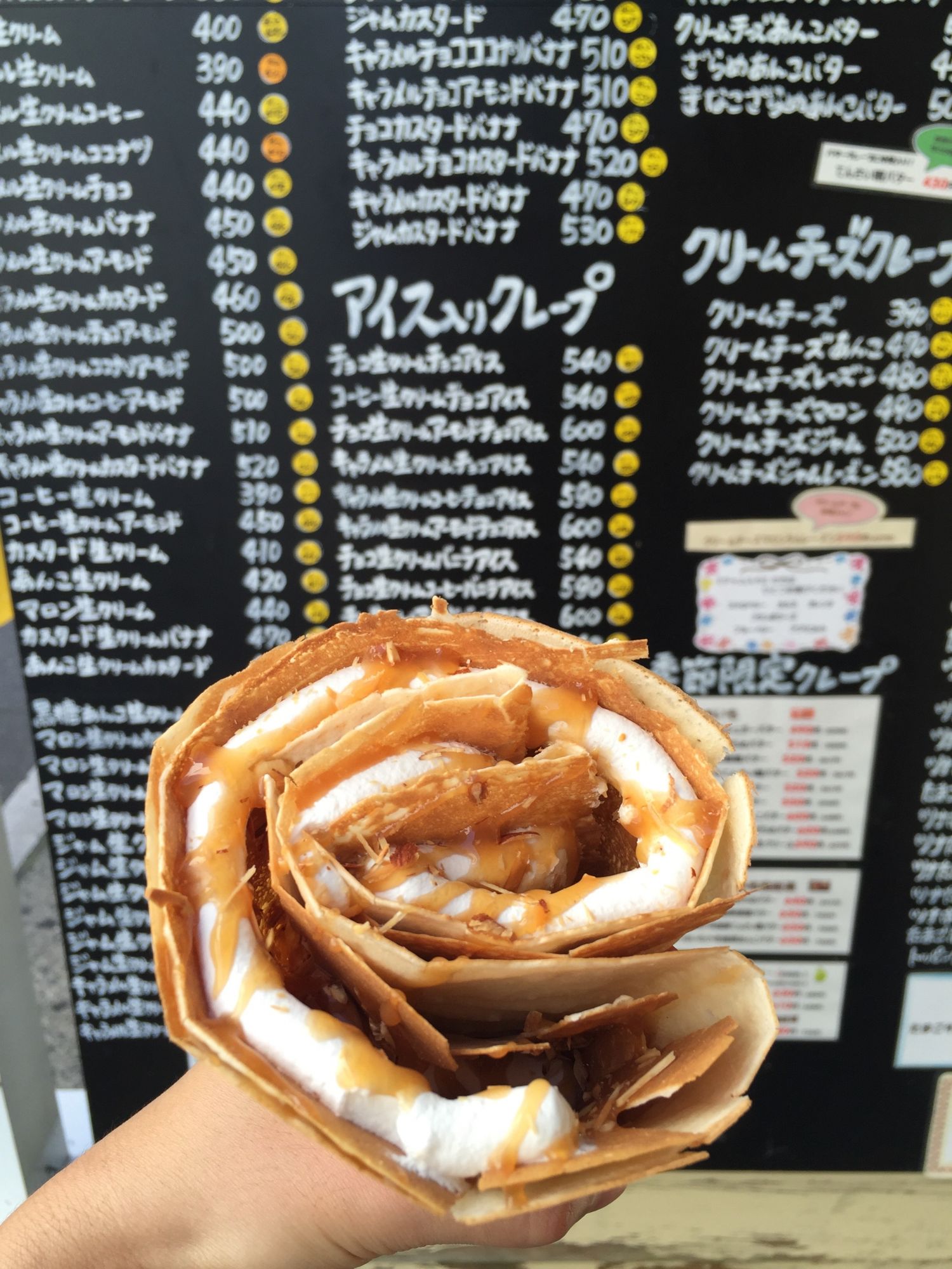 นอกจากเครปไส้วิปครีม (หรือจะไม่เอาวิปครีมก็ได้) เครปพิซซ่าที่สามารถพบเห็นได้ทั่วไปแล้วแล้ว ที่นี่ยังมีเครปสลัดผักด้วยนะคะ มีสลัดให้เลือกมากมายเช่น สลัดทูน่า สลัดไข่ สลัดมันฝรั่ง แฮมข้าวโพด ทูน่าข้าวโพด หรือจะไส่ทั้ง ทูน่า ไข่ แฮม ข้าวโพดก็ได้ ห่อด้วยแป้งเครปกรอบๆ ซึ่งเป็นเมนูที่ได้รับความนิยมมากๆ ด้วยค่ะแต่ขอบอกว่าถ้าไส่ไส้หลายอย่าง ราคาอาจถึง 700 เยนได้ สำหรับเครปไส้สลัดที่ผ่านมายังไม่เคยลองชิมแต่ถ้าได้ชิมแล้วจะนำมาเขียนรีวิวอีกนะคะ ราคาจะเขียนไว้ที่เมนู ตัวหนังสือสีขาวคือราคาไม่รวมภาษี ส่วนในวงกลมสีเหลืองๆ คือ ราคาที่รวมภาษีแล้วค่ะ