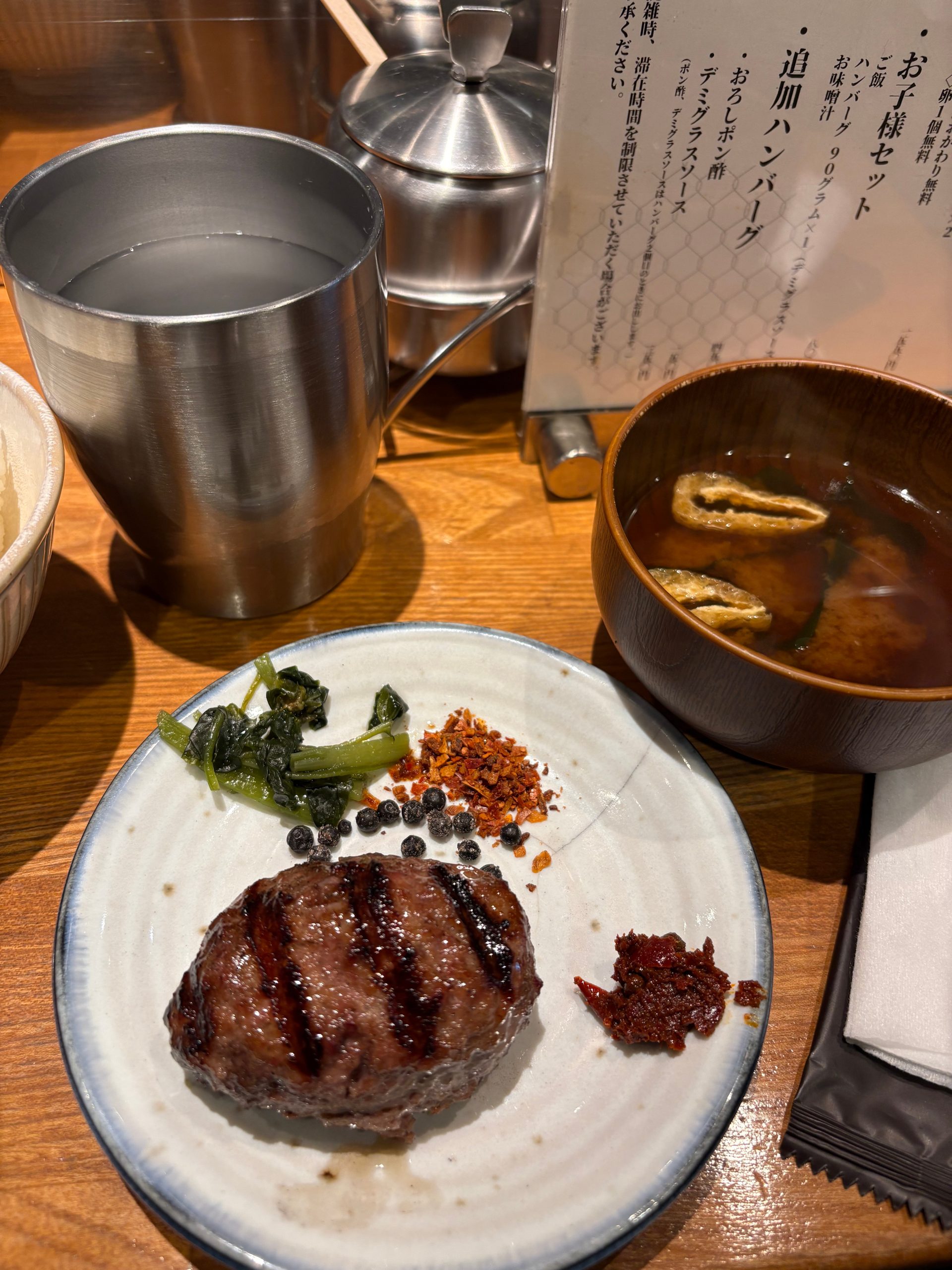 สำหรับอาหารมื้อกลางวันเค้าจะมีเมนูให้เลือก 2 ราคา คือ แฮมเบิร์ก 3 ชิ้น+ข้าว(เติมได้ไม่อั้น)+ซุปมิโซ+ไข่ดิบฟรี 1 ใบ 1,750 เยน กับแฮมเบิร์ก 2 ชิ้น+ข้าว(เติมได้ไม่อั้น)+ซุปมิโซ+ไข่ดิบฟรี 1 ใบ 1,550 เยน (แนะนำให้สั่งชุดแบบ 3 ชิ้นคุ้มกว่าเพราะแฮมเบิร์กอร่อยมาก) หากต้องการสั่งแฮมเบิร์กเพิ่ม ราคาชิ้นละ 450 เยน แฮมเบิร์กที่เค้าย่างถ่านเสร็จแล้วเค้าจะเอามาวางไว้บนตระแกรงตรงที่นั่งของลูกค้า ลูกค้าก็คีบทานตามชอบ แต่ทางร้านเค้าจะแนะนำว่าชิ้นแรกลองทานเปล่าๆ แบไม่ต้องราดซ้อสก่อนจะได้ลิ้มรสชาติแฮมเบิร์กอย่างเต็มที่