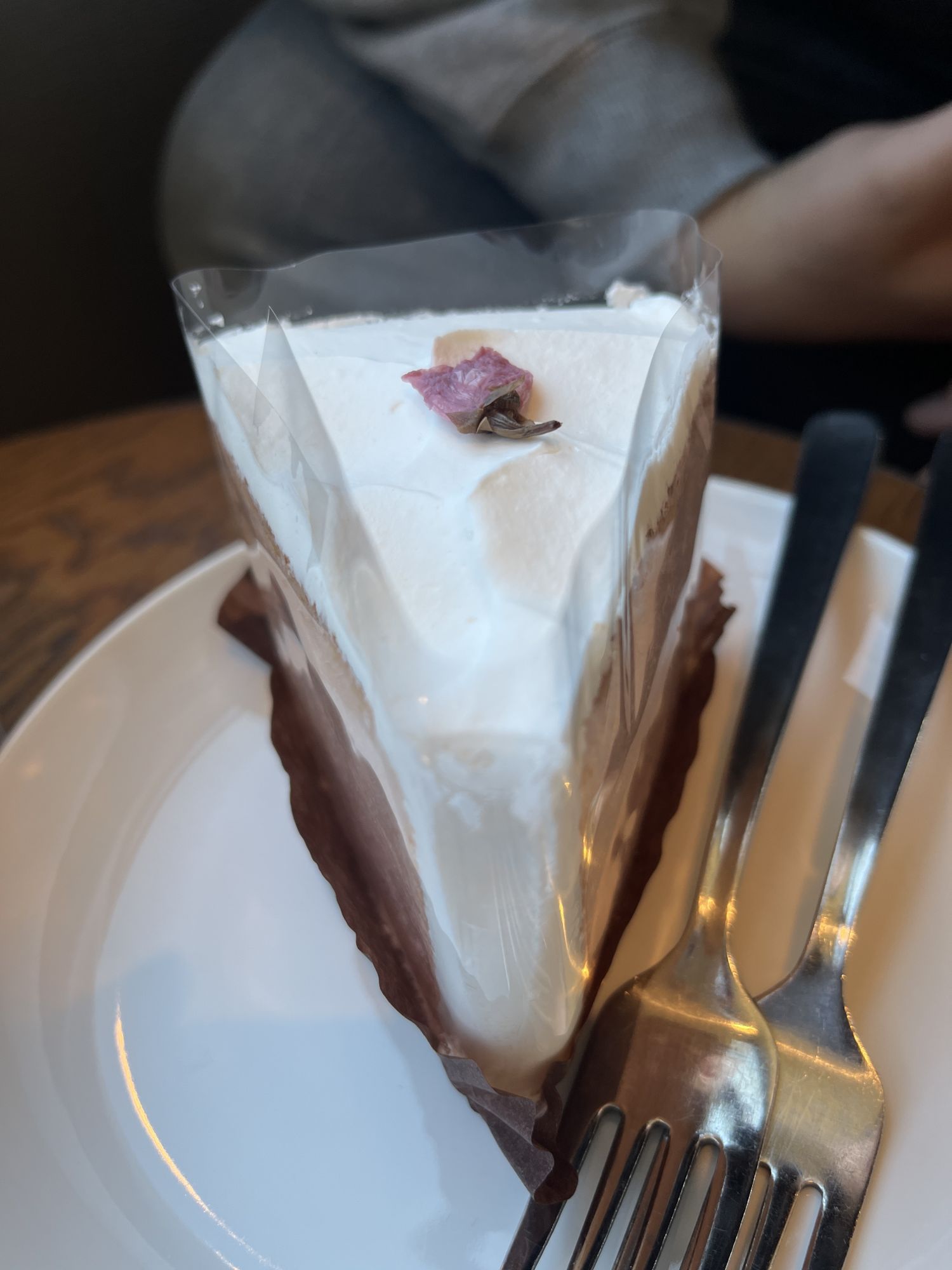 เค้กชิฟฟอนกลิ่นและรสชาติดอกซากุระอันอ่อนโยน แป้งมีลักษณะเหนียวนุ่ม ยืดหยุ่น มีเนื้อสัมผัสที่ชุ่มชื้น ละลายในปากได้ง่าย โดยมีการนวดผงใบเชอร์รี่ลงไปด้วย ด้านบนมีดอกซากุระดองเค็มด้วย  รสเค็มเพิ่มรสชาติให้กับเค้กหวาน ทำให้เพลิดเพลินจนคำสุดท้าย  สีของแป้งและสีของดอกซากุระที่อยู่ด้านบนเป็นเฉดสีอ่อนๆ ที่ทำให้นึกถึงฤดูใบไม้ผลิ ส่งผลให้เค้กดูเหมือนกับว่าเป็นดอกซากุระ