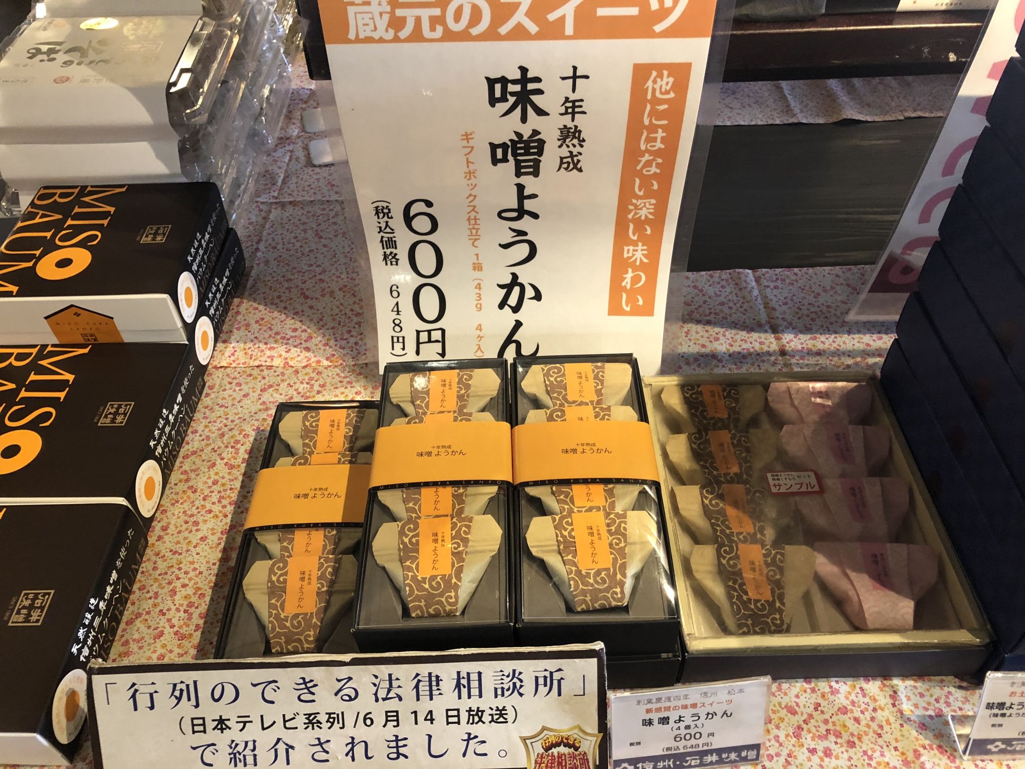 ของฝากมีให้เลือกมากมาย ตั้งแต่มิโซะสีขาว มิโซะสีแดง หมักนาน 1 ปีขึ้นไปจนถึง 3 ปี เค้าจะมีเขียนระบุไว้ นอกจากนี้ยังมีขนมที่ทำจากมิโซะ และไอศครีมรสมิโซะ