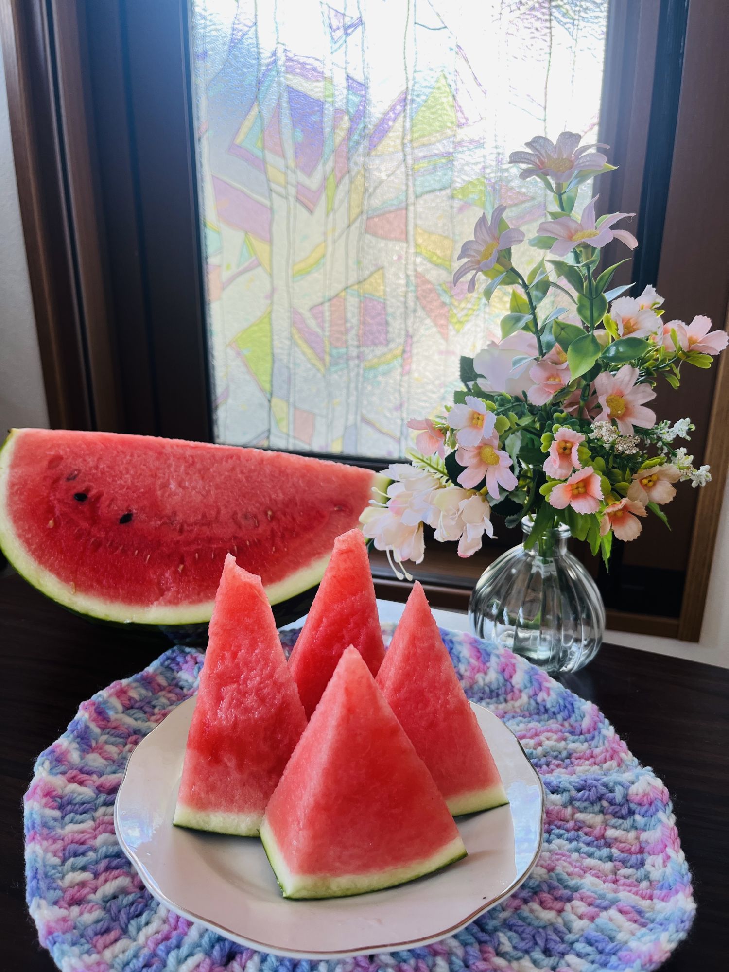 แตงโมฮาตะพันธุ์เด่น: “Summer vacation in Shinshu” ลักษณะเด่นของรสชาติและเนื้อ มีเนื้อสีแดงสดและเนื้อกรุบกรอบ มีเมล็ดน้อยและเนื้อแน่น ทำให้รับประทานได้ง่ายมาก