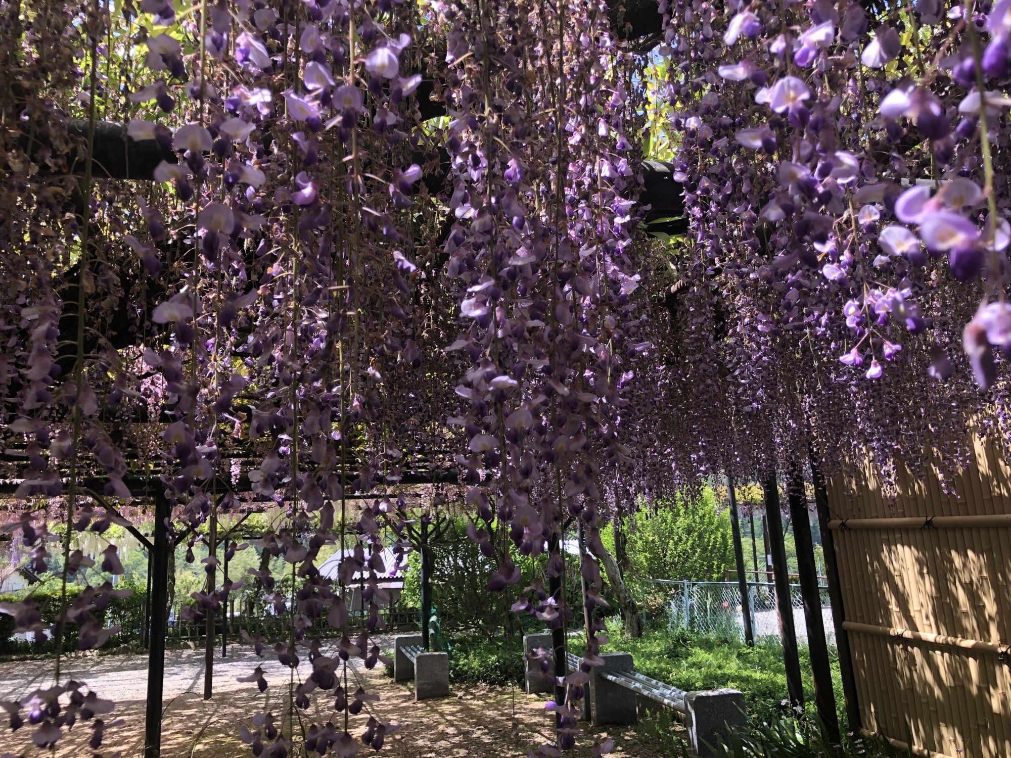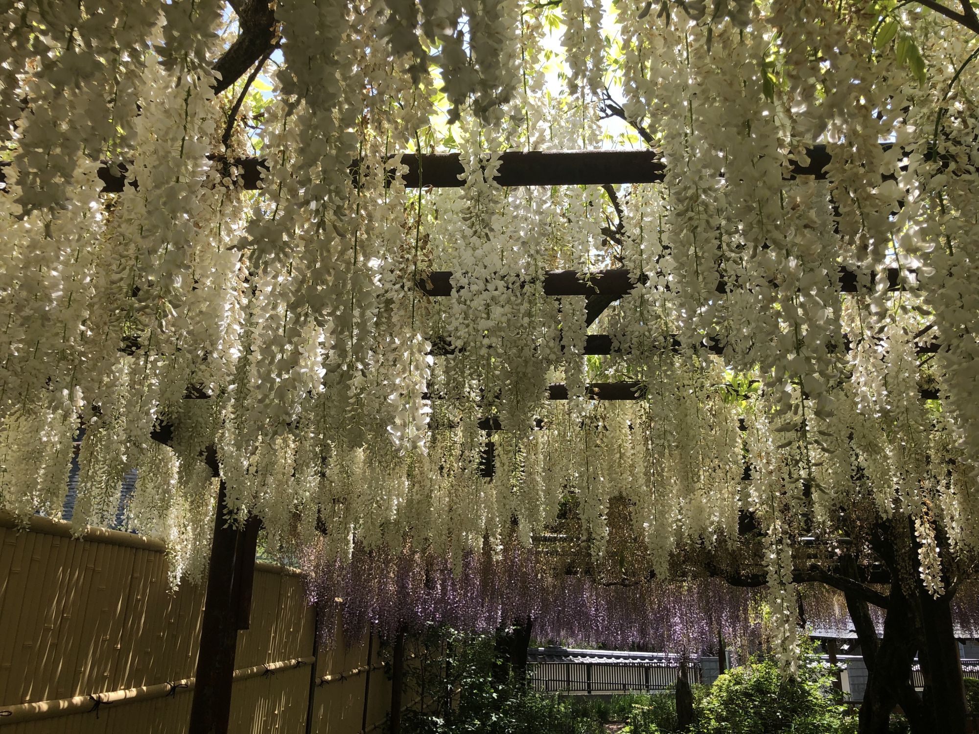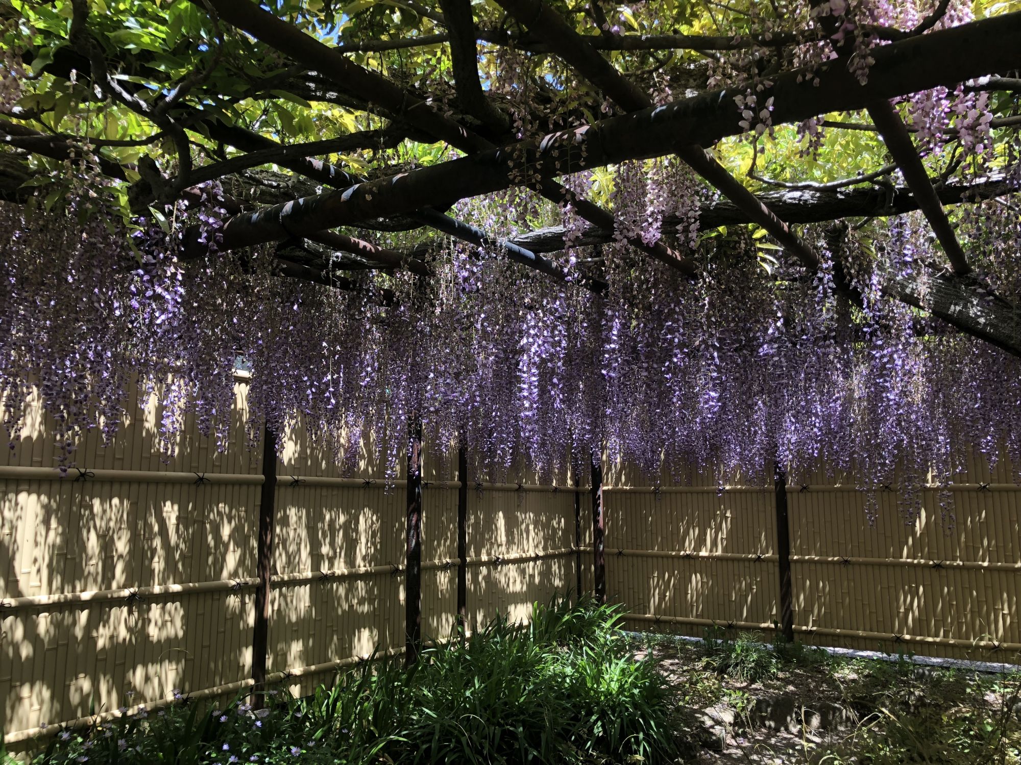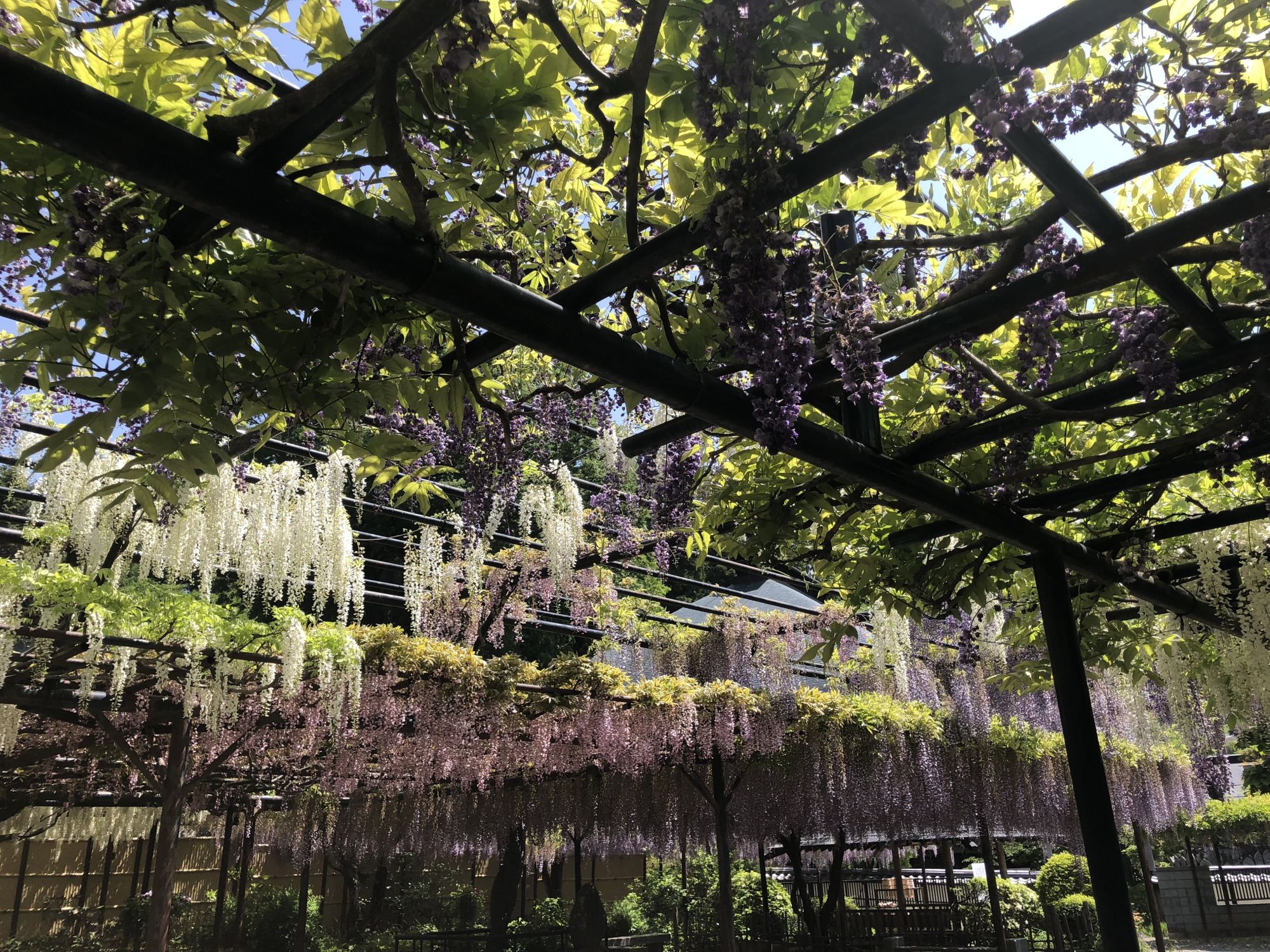 บริเวณซุ้มดอกวิสทีเรีย มีทั้งสีม่วงช่อยาว สีม่วงช่อสั้น สีขาวหอมเหมือนกล้วยไม้ และดอกสีชมพูอ่อน (ถ่ายภาพเมื่อวันที่ 17 พฤษภาคม 2023 ดอกฟูจิเริ่มโรยแล้วบางส่วน)