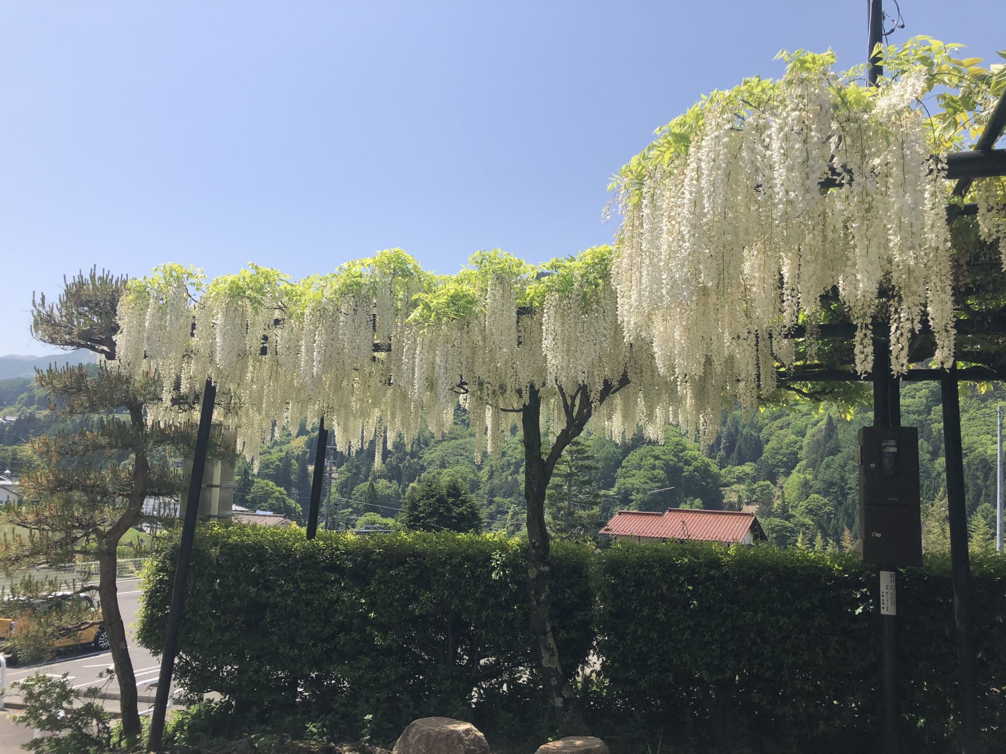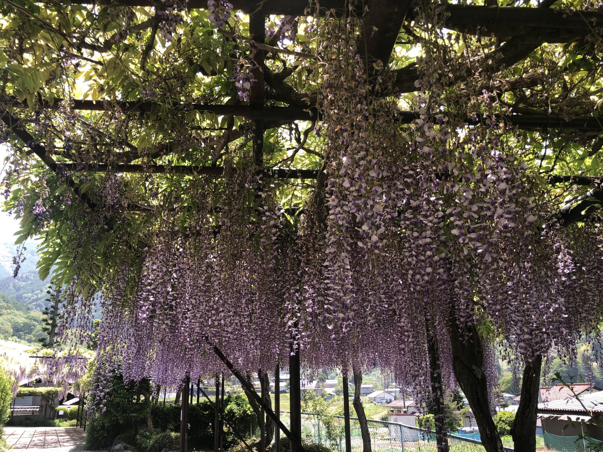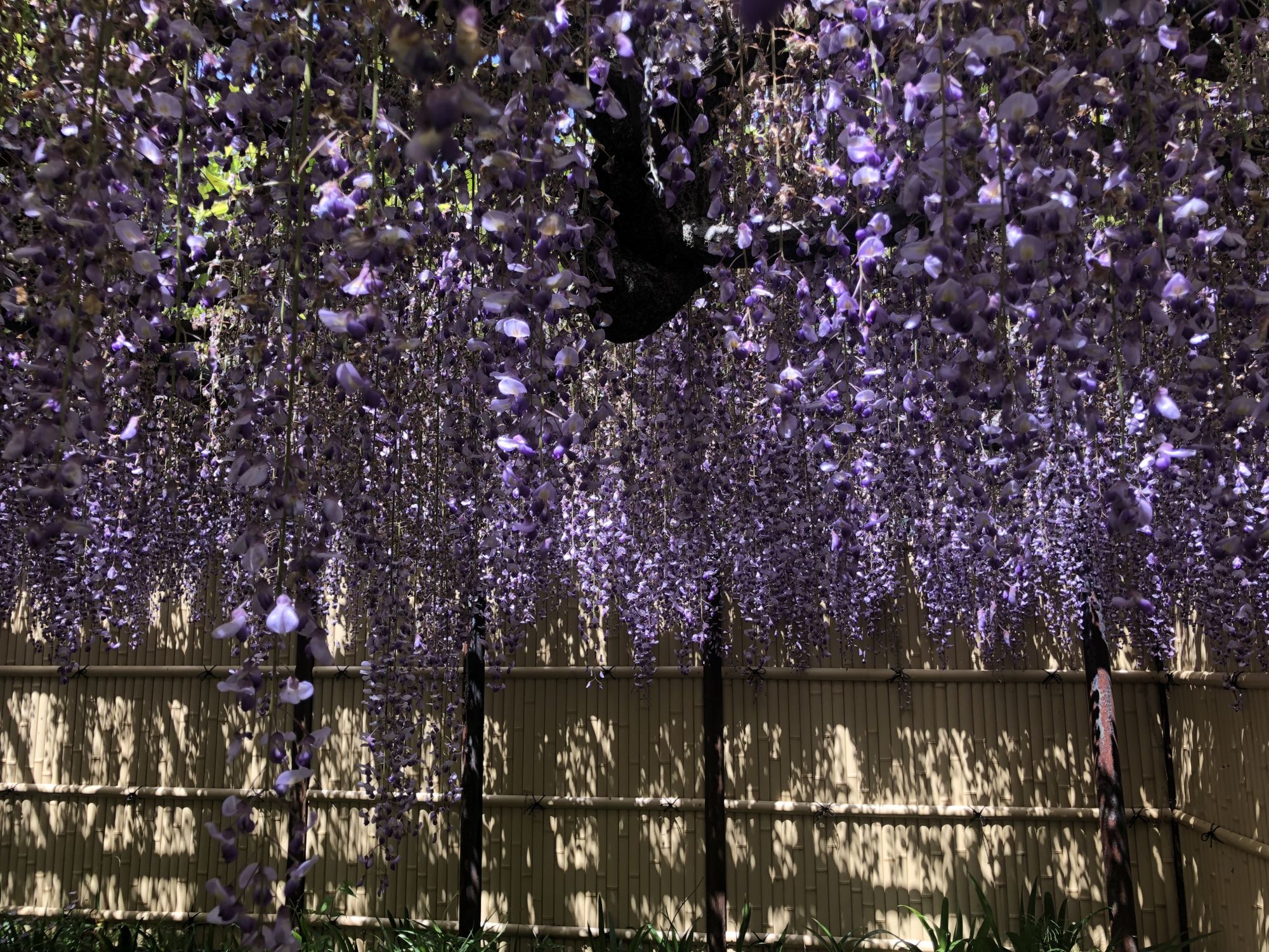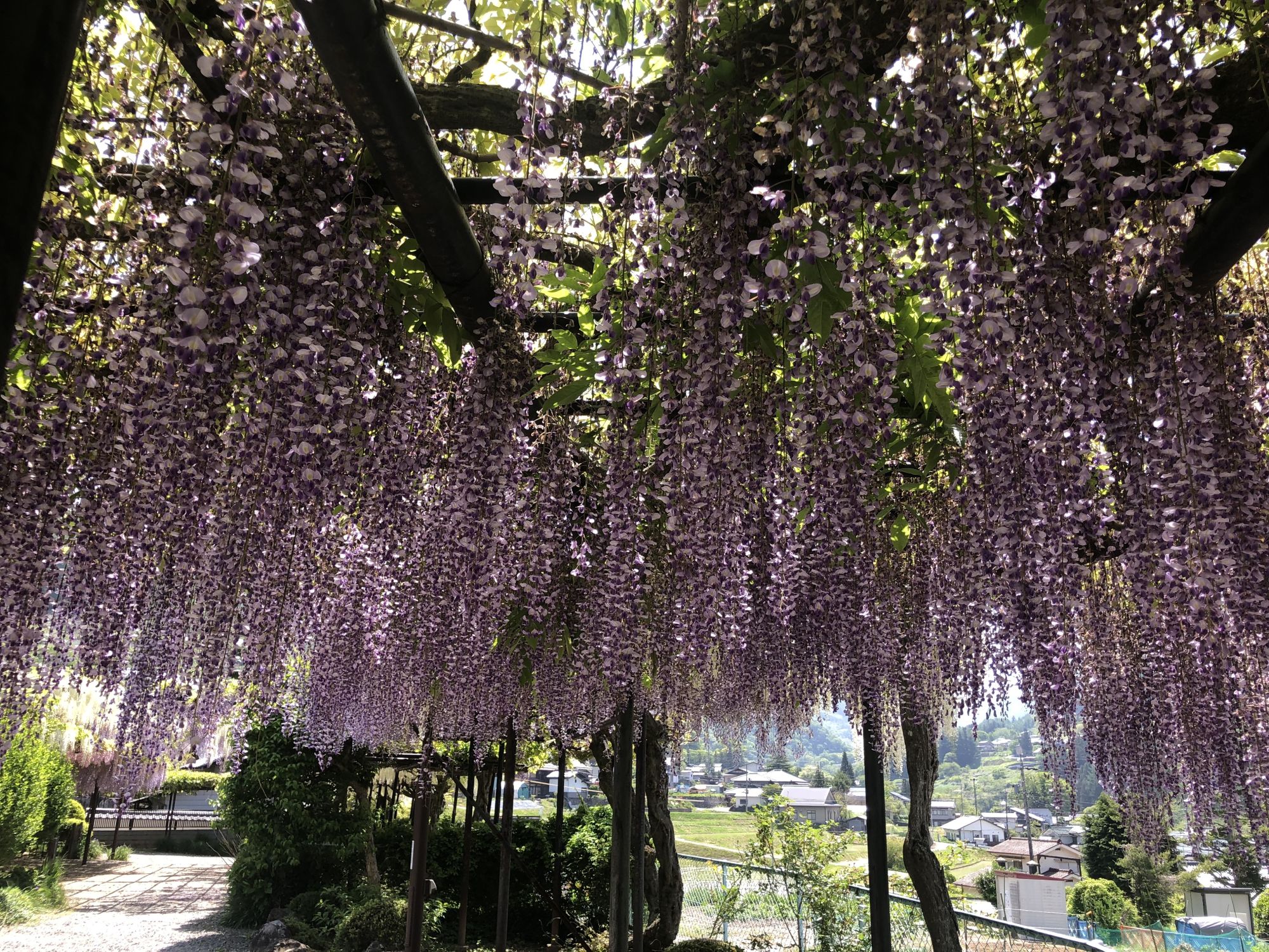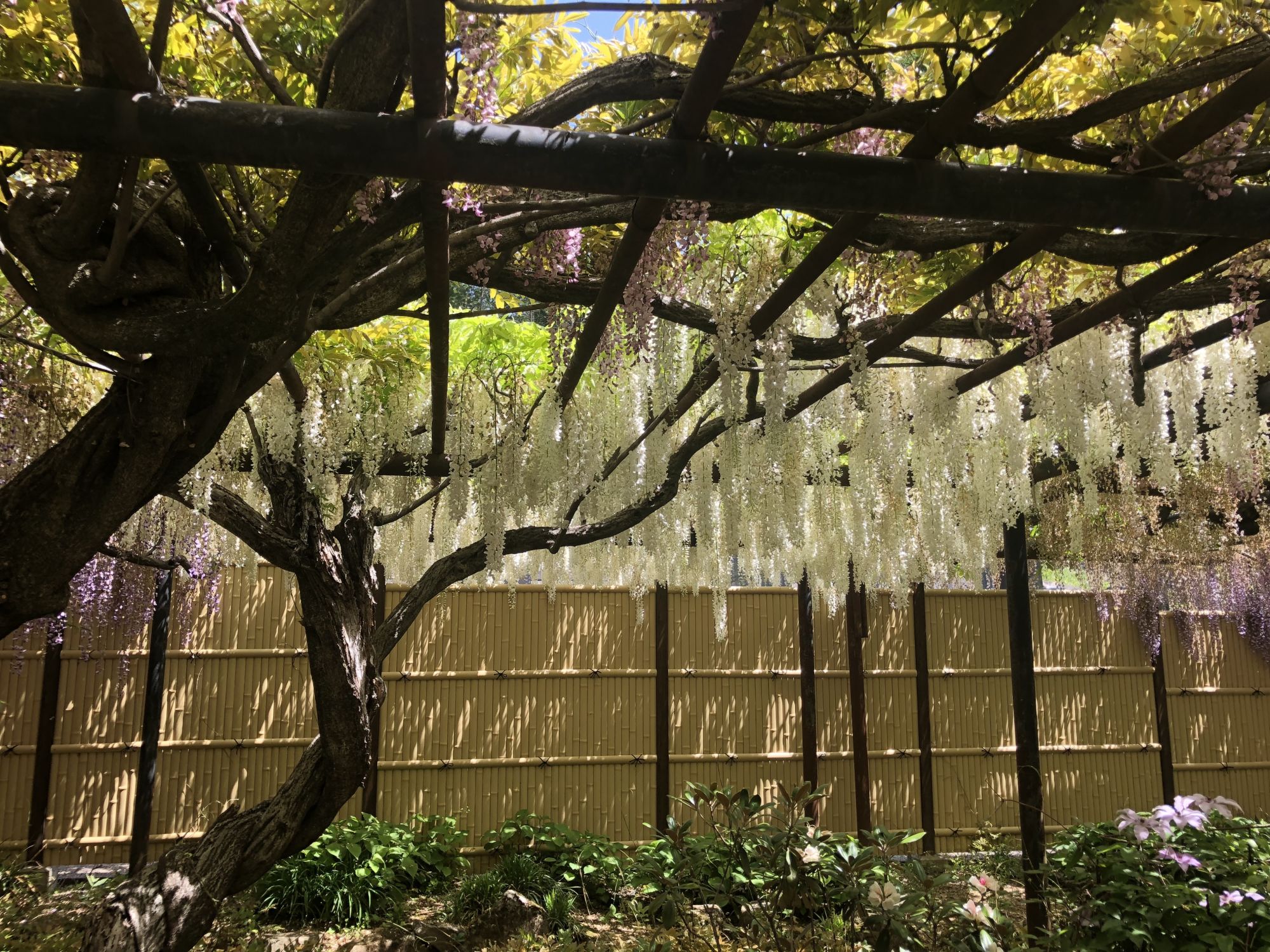 บริเวณซุ้มดอกวิสทีเรีย มีทั้งสีม่วงช่อยาว สีม่วงช่อสั้น สีขาวหอมเหมือนกล้วยไม้ และดอกสีชมพูอ่อน (ถ่ายภาพเมื่อวันที่ 17 พฤษภาคม 2023 ดอกฟูจิเริ่มโรยแล้วบางส่วน)