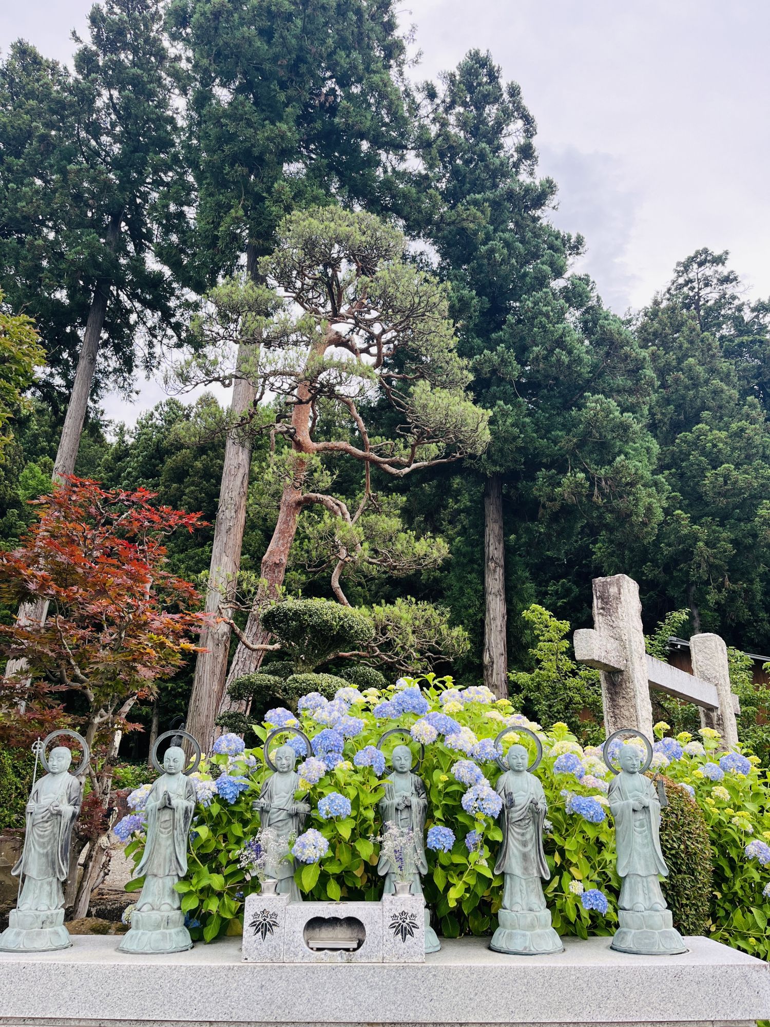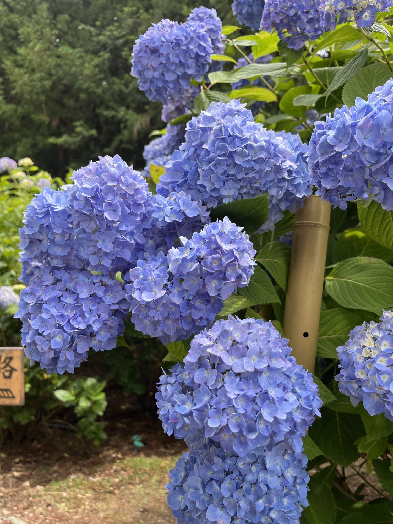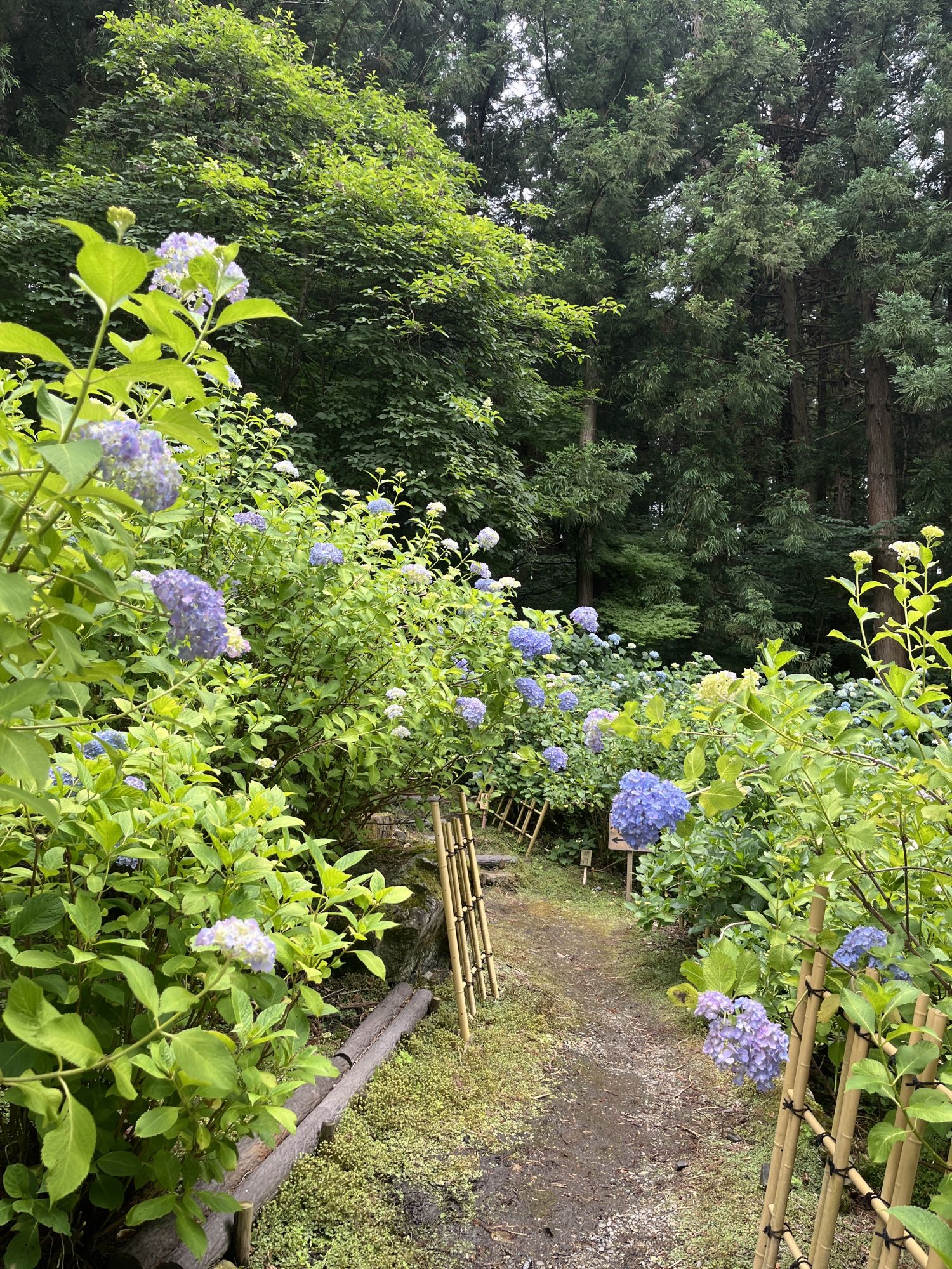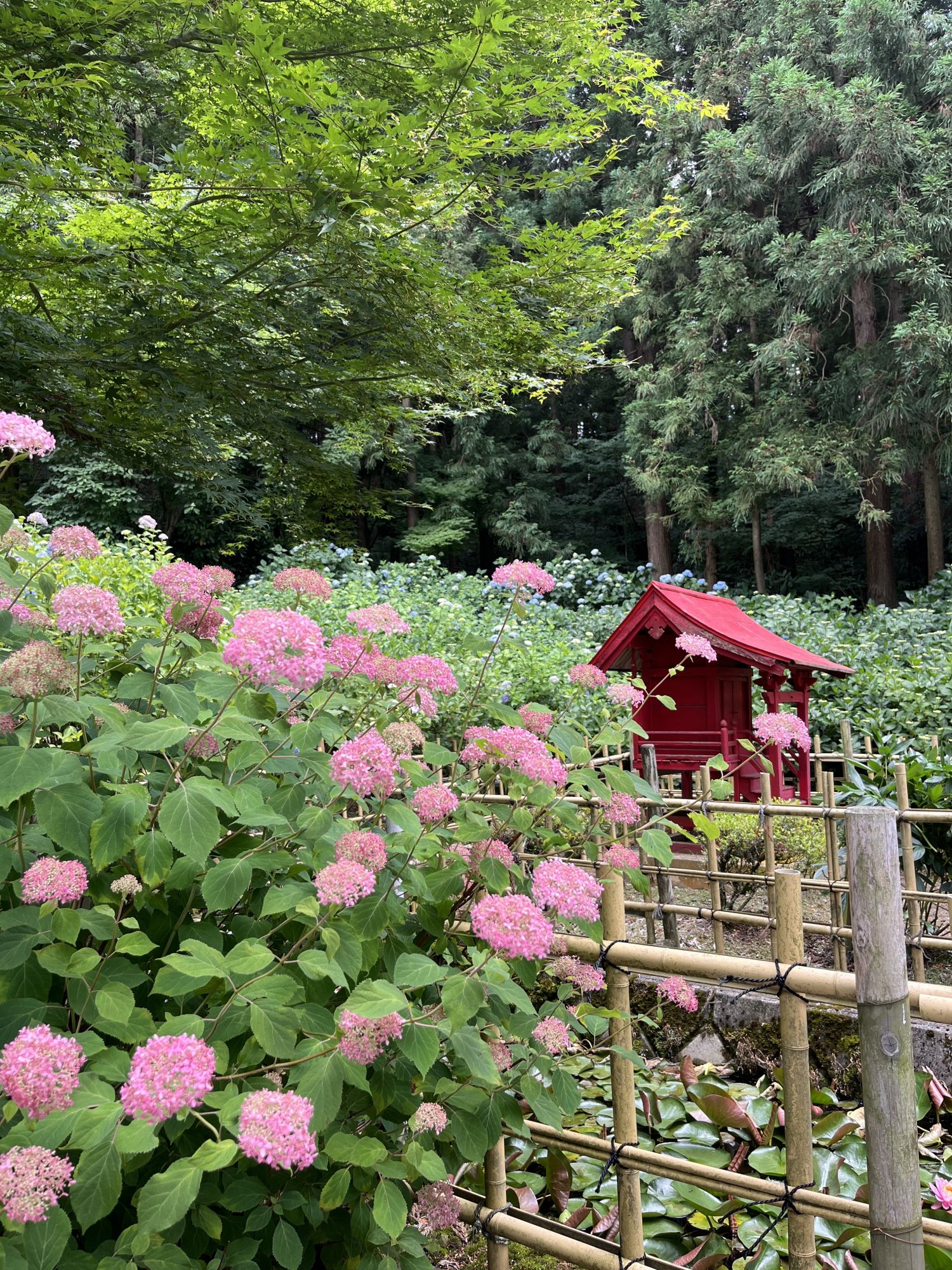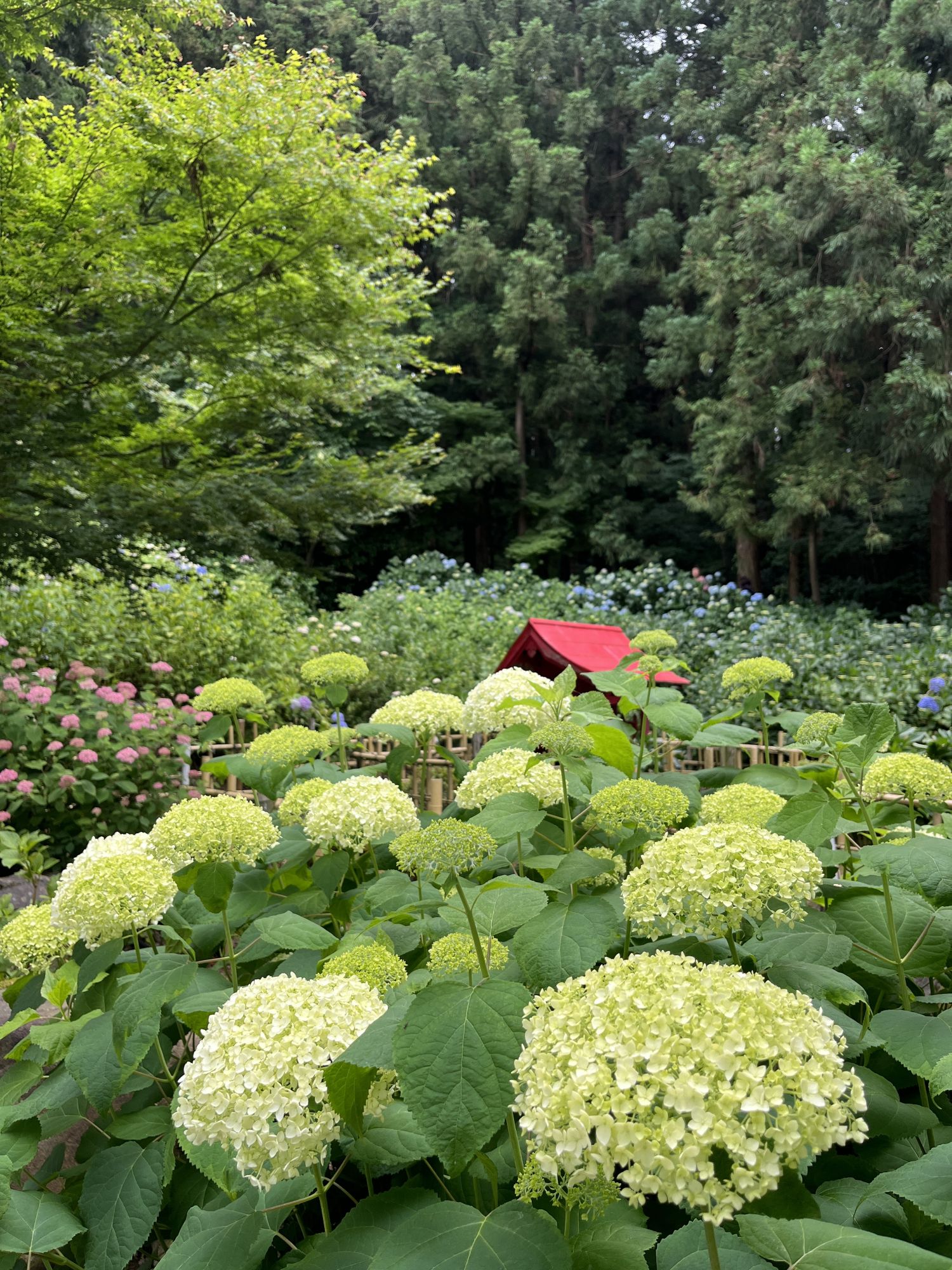 สวนไฮเดรนเยียที่นี่มีดอกไฮเดรนเยีย 90 สายพันธุ์บานสะพรั่ง ใต้ดอกไฮเดรนเยียแต่ละดอกจะมีป้ายชื่อพันธุ์ดอกไฮเดรนเยียเขียนไว้ เพื่อให้ผู้มาเยือนทราบว่าเป็นพันธุ์อะไร การได้ชมดอกไฮเดรนเยียหลังจากเห็นชื่อพันธุ์แล้วนั้นช่างรื่นรมย์น่าสนใจ เพราะบางคนอาจไม่เข้าใจว่าทำไมถึงตั้งชื่อนี้ ภายในสวน คุณจะได้พบกับรูปปั้นพระโพธิสัตว์กวนอิม สวนดอกไฮเดรนเยียและพุ่มไม้เล็กๆ และคูน้ำรอบวัดเบ็นเท็นโดที่ดอกบัวสายกำลังบานสะพรั่ง บนเนินเขาด้านหลังวิหารหลัก มีดอกไฮเดรนเยียและไฮเดรนเยียภูเขาสายพันธุ์หายาก และคุณสามารถเพลิดเพลินกับดอกไฮเดรนเยียหลากหลายสายพันธุ์ที่คุณไม่เคยเห็นมาก่อนค่ะ
