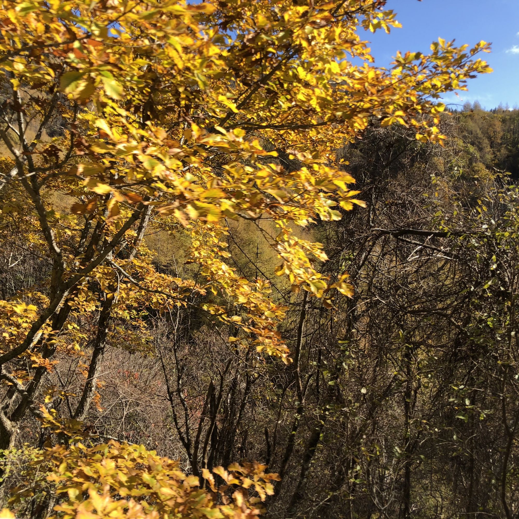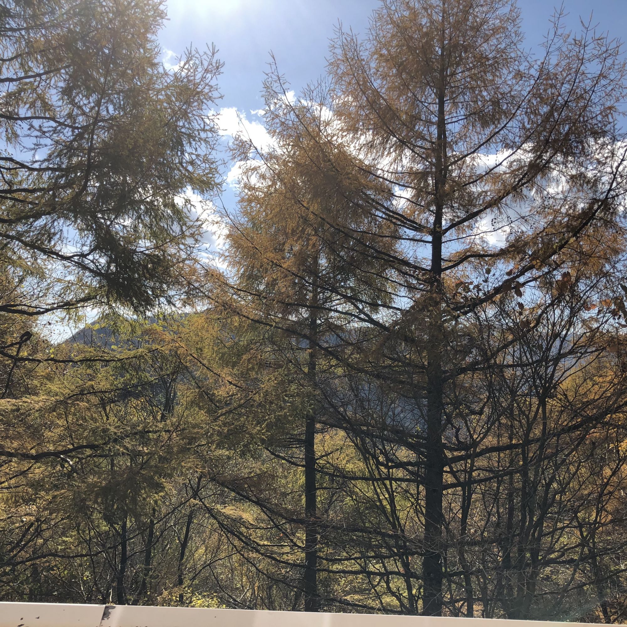 เมื่อขับรถขึ้นไปบนยอดเขาใบไม้ข้างบนเริ่มเป็นสีน้ำตาลและร่วงแล้วบางส่วน แต่ด้านล่าง ตรงเชิงเขาใบไม้ยังไม่ค่อยเปลี่ยนสี
