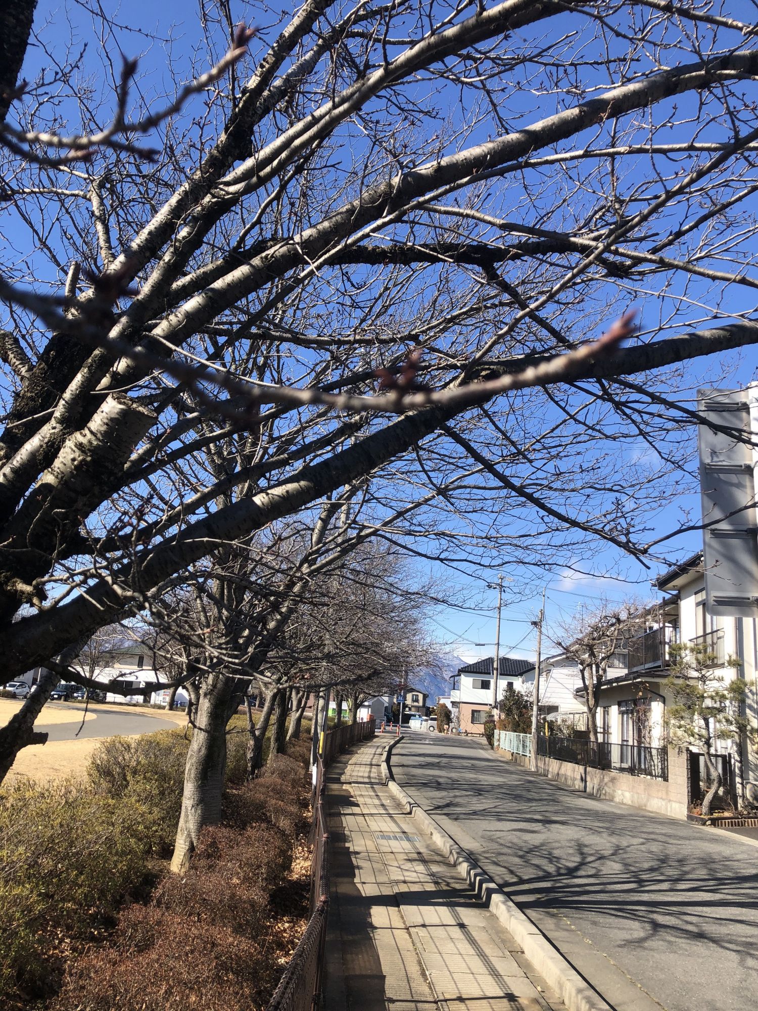 กิ่งของต้นซากุระรอบๆ สวนสาธารณะเริ่มเป็นสีชมพูแล้ว แต่ว่ากว่าจะออกเป็นดอกซากุระให้เห็นก็ต้องรอจนกว่าจะถึงเดือนมีนา วันนี้อากาศดีท้องฟ้าโปร่ง มองเห็นเทือกเขาแอลป์ญี่ปุ่นได้ 360 องศา แต่เห็นฟ้าโปร่งแบบนี้อากาศก็ติดลบและลมแรงมากๆค่ะ ถ้าช่วงหิมะตก ลมแรง หนาวจัด จะมองไม่เห็นภูเขาได้ชัดเจนแบบนี้