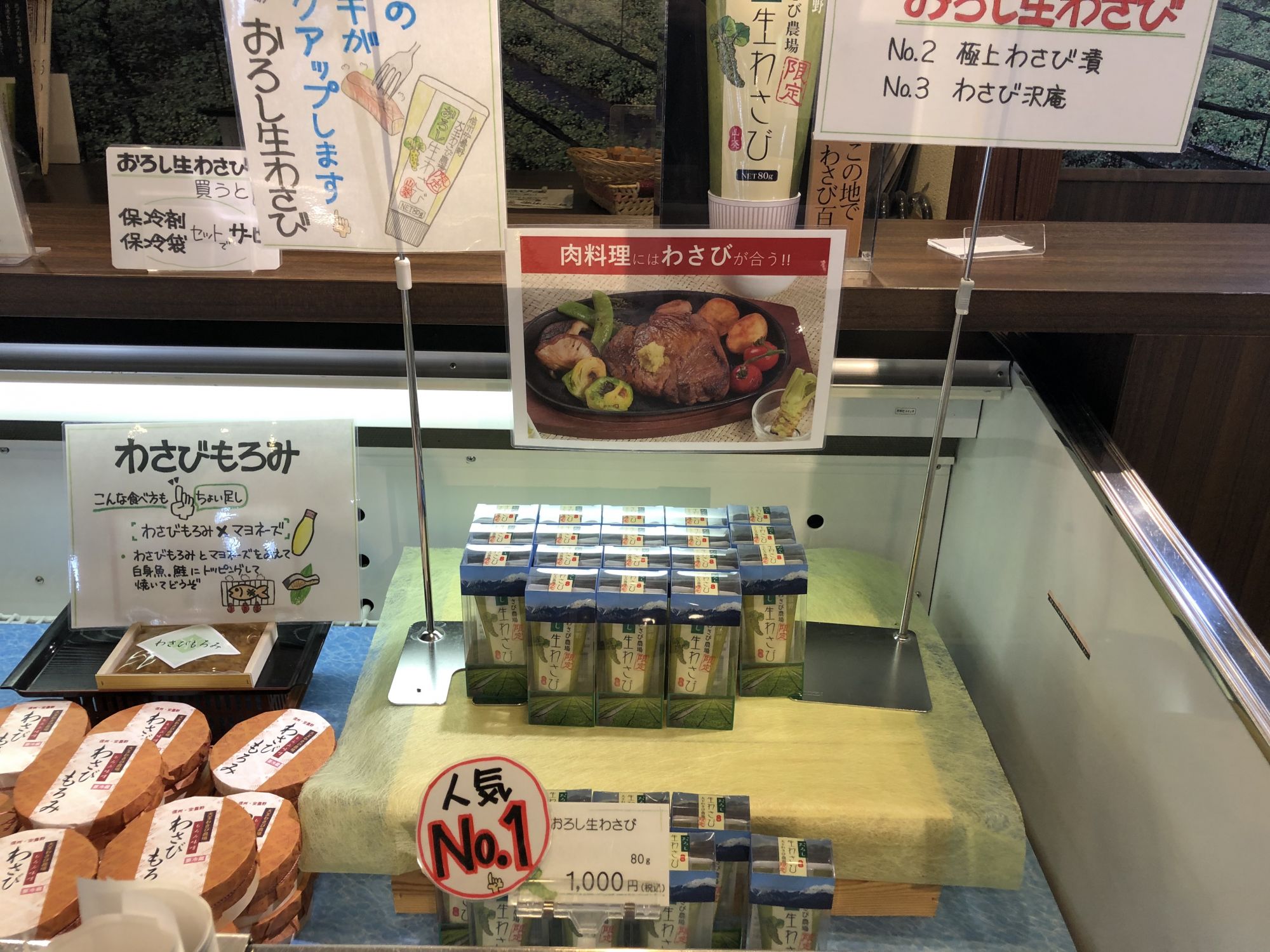 สามารถซื้อผักดอง ลูกอม อาหาร และขนมรสวาซาบิได้ที่ร้านขายของที่ระลึก ทานไอศครีมรสวาซาบิที่ร้านขายไอศครีม หรือจะชิมอาหารที่ทำจากวาซาบิที่ร้านอาหารก็ได้
