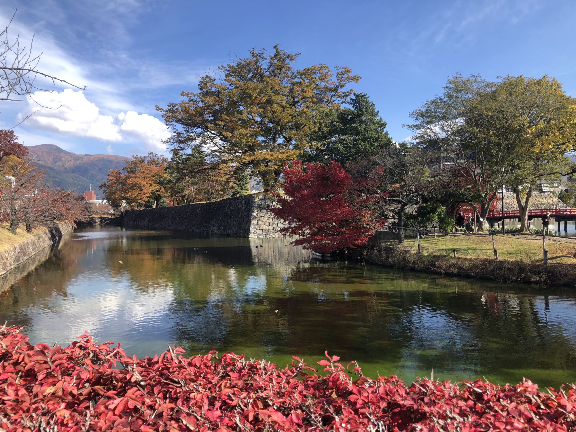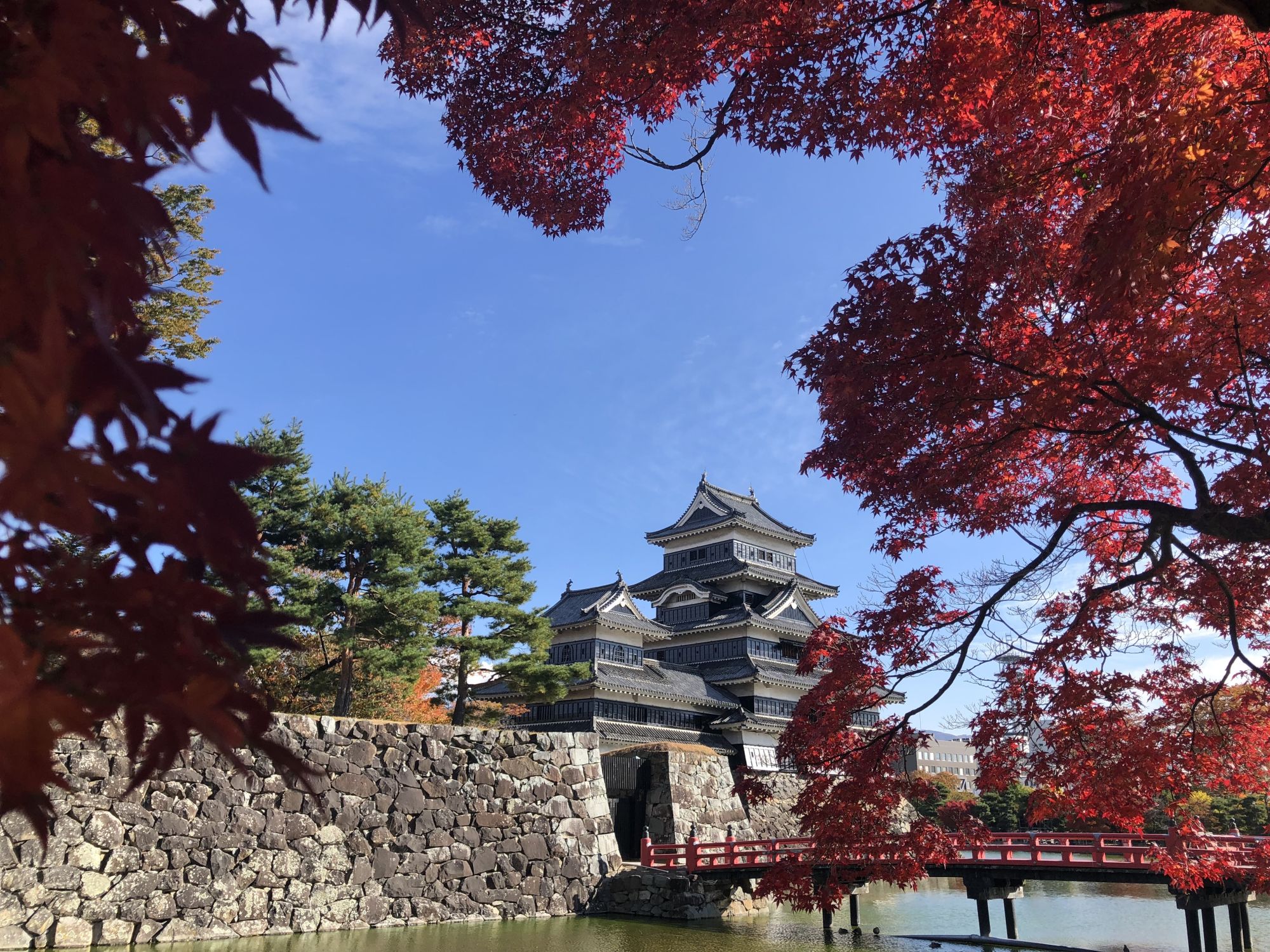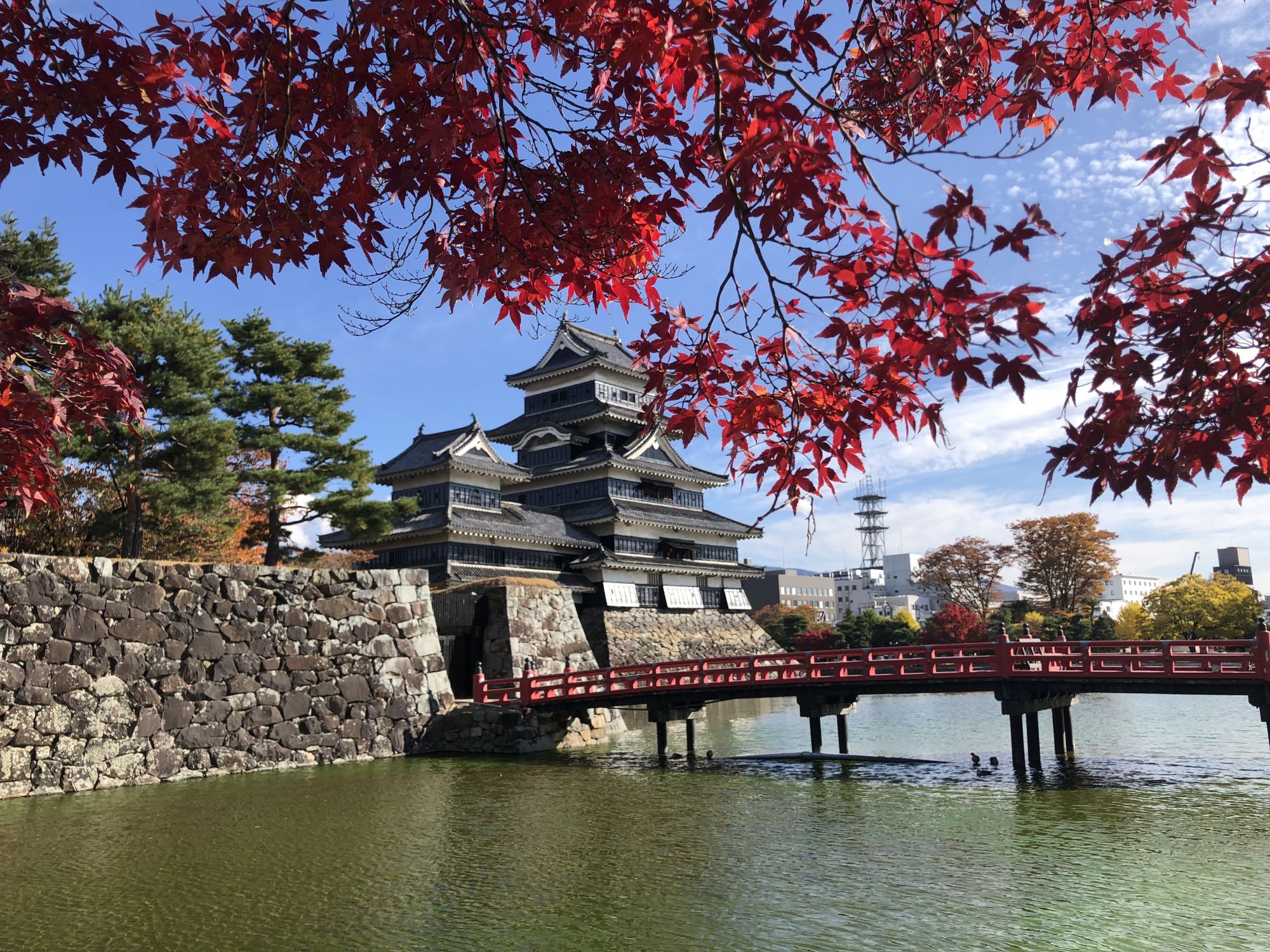 ช่วงนี้ใบไม้กำลังเปลี่ยนสีสวยงาม บางต้นก็เริ่มร่วงแล้ว ที่ผ่านมาเคยนำรูปช่วงดอกซากุระบานที่ปราสาทมัตสึโมโต้มาเขียนบล็อกแล้ว คราวนี้จะพาไปชมบรรยากาศช่วงฤดูใบไม้เปลี่ยนสีบ้าง แต่ต้องขอบอกก่อนว่าช่วงดอกซากุระบานที่สวนสาธารณะปราสาทมัตสึโมโต้และคูน้ำรอบปราสาทจะเต็มไปด้วยดอกซากุระ แต่ช่วงฤดูใบไม้เปลี่ยนสีก็มีใบไม้เปลี่ยนสีให้ชมบ้างแต่ไม่ได้อลังการเหมือนตอนซากุระบาน แต่เนื่องจากยังไม่เคยเอารูปช่วงใบไม้เปลี่ยนสีมาลง ก็เลยลองเดินหามุมว่าจะมีมุมไหนที่ถ่ายรูปออกมาแล้วสวยงามได้เห็นทั้งใบไม้เปลี่ยนสีและตัวปราสาท ก็เลยเดินรอบๆ ปราสาทโดยอ้อมไปทางคูน้ำด้านหลังปราสาท ใกล้กับสะพานสีแดง ก็เห็นต้นเมเปิ้ลต้นหนึ่งสีแดงสวยมาก ลองไปหามุมถ่ายภาพดูก็เลยได้ภาพออกมากอย่างที่เห็นค่ะ