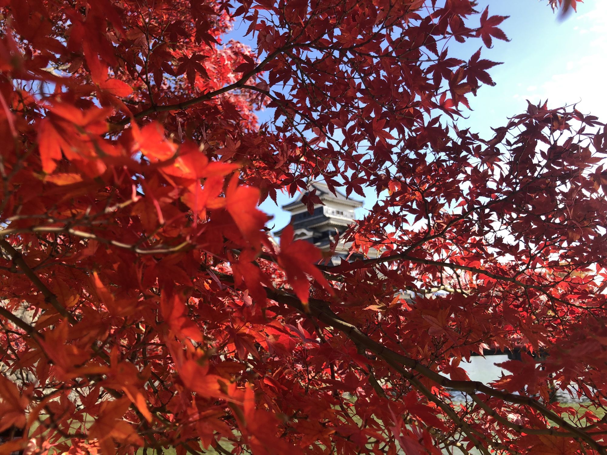 ตรงใต้ต้นเมเปิ้ลริมคูน้ำด้านหลังปราสาทใกล้กับสะพานสีแดง พอถ่ายรูปออกมาแล้วได้เห็นทั้งปราสาทท่ามกลางใบเมเปิ้ลสีแดงสด ส่วนตัวแล้วเท่าที่เดินหามุมถ่ายรูปทั่วทั้งปราสาท คิดว่าถ่ายรูปปราสาทจากเมเปิ้ลต้นนี้แล้วออกมาสวยที่สุด แต่ต้องใช้เวลาถ่ายพอสมควรเพราะลมพัดแรง ใบเมเปิ้ลเคลื่อนไหวไปมาตลอดเวลา บังตัวปราสาท ก็เลยได้รูปแบบที่เห็นด้านล่างนี้ บางรูปมีใบเมเปิ้ลล้อมรอบ บางรูปใบเมเปิ้ลก็บังตัวปราสาท