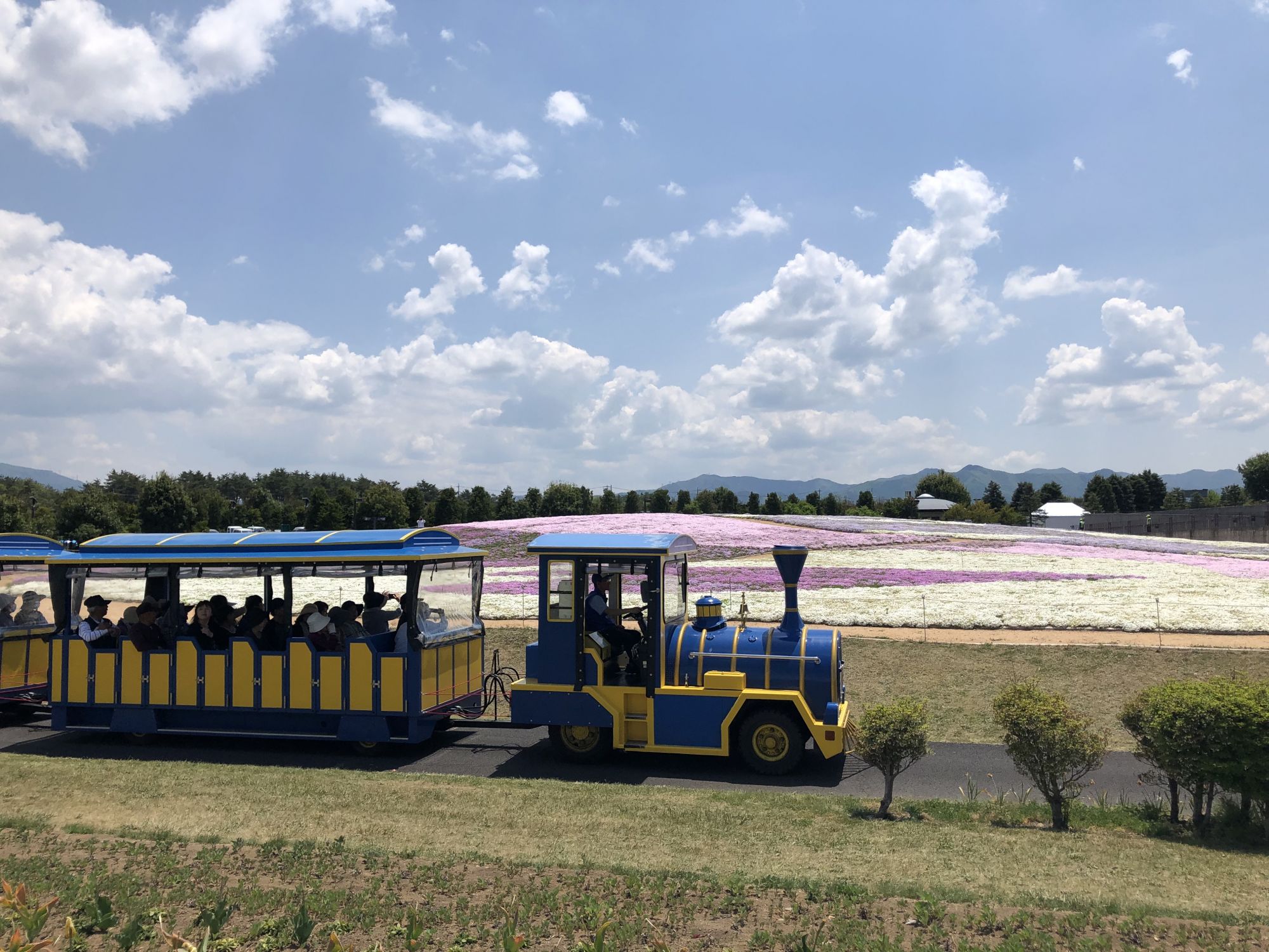 ห่างออกไปหน่อยจะมีทุ่งดอกชิบะซากุระสีสันน่ารักด้วยค่ะ แต่ต้องเดินจากที่จัดงานหลักค่อนข้างไกลหน่อยนะคะ ถ้าไม่อยากเดินนั่งรถไฟไปก็ได้ค่ะ