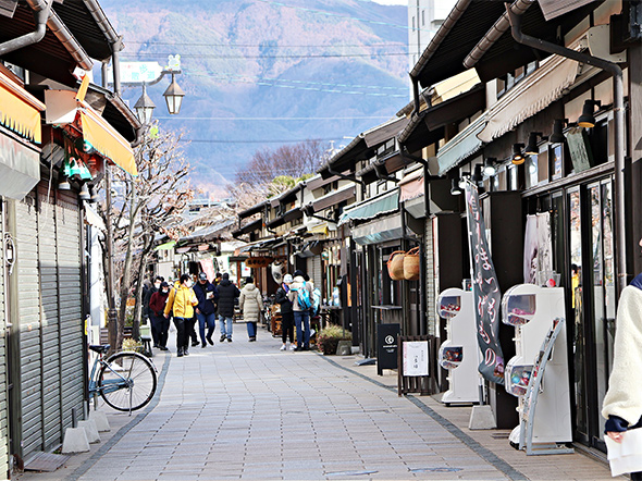 ถนนนาวาเตะอยู่ใกล้ปราสาทมัตสึโมโตะ เป็นถนนช้อปปิ้งประวัติศาสตร์ที่จัดให้เป็นโซนคนเดิน สัมผัสบรรยากาศแบบเก่าแก่ของถนน พร้อมร้านค้าที่หลากหลาย เช่น คาเฟ่ เบเกอรี่ และร้านของใช้ ทำให้การเดินเล่นสนุกสนานยิ่งขึ้น ในฤดูหนาว ถนนจะเต็มไปด้วยความสงบ และคุณสามารถอุ่นใจด้วยของว่างร้อน ๆ อย่างไทยากิอบร้อน ๆ หรือกาแฟสดร้อน ๆ บนถนนที่เป็นจุดพบกันของความดั้งเดิมและเสน่ห์ร่วมสมัยของมัตสึโมโตะ ให้คุณสนุกกับการเดินเล่นในเมืองอย่างสบายใจ