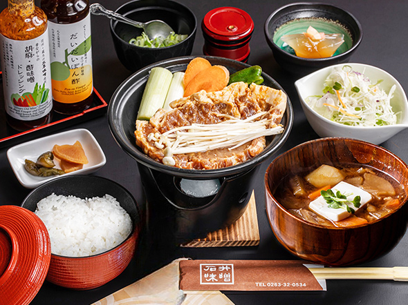 มื้อกลางวันที่อิชิอิมิโสะภายในโรงหมักมิโสะที่ยังคงบรรยากาศประวัติศาสตร์กว่า 150 ปี คือประสบการณ์สุดพิเศษของ “มิโสะเต็มโต๊ะ” ที่หาไม่ได้จากที่อื่น สำหรับชุดอาหารชินชูหมูสันในที่ต้องจองล่วงหน้า 2 วันนั้นใช้เทคนิคการปรุงแบบดั้งเดิมของโรงงาน เช่น การใช้มิโสะผสมและโคจิเกลือทำให้รสชาติเด่นเป็นเอกลักษณ์ นอกจากนี้ยังมีเมนูสั่งได้ในวันที่เข้าชม เช่น เกี๊ยวซ่ารสมิโสะ และชุดข้าวปั้น ส่วนของหวานก็มีไอศกรีมรสมิโสะที่รสชาติเข้มข้นและกลมกล่อมอย่างลงตัว