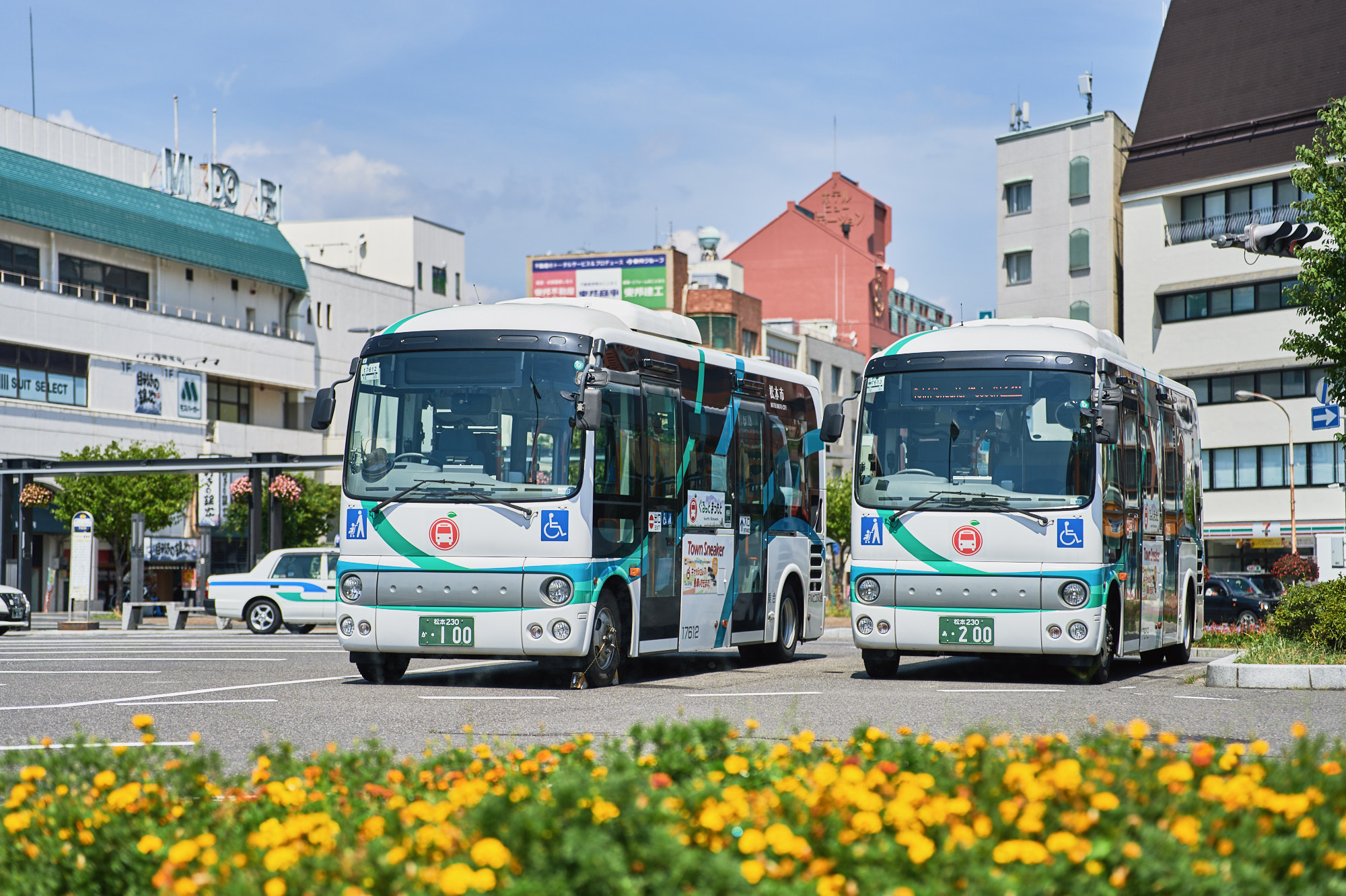松本市の中心部を走る可愛いバス「タウンスニーカー」は、市街地の有名観光スポットを巡るのにぴったりな周遊バスで、駅前のロータリーから出発します。北コースは松本城や旧開智学校、東コースは中町通り・松本市美術館・あがたの森公園などにご利用ください。