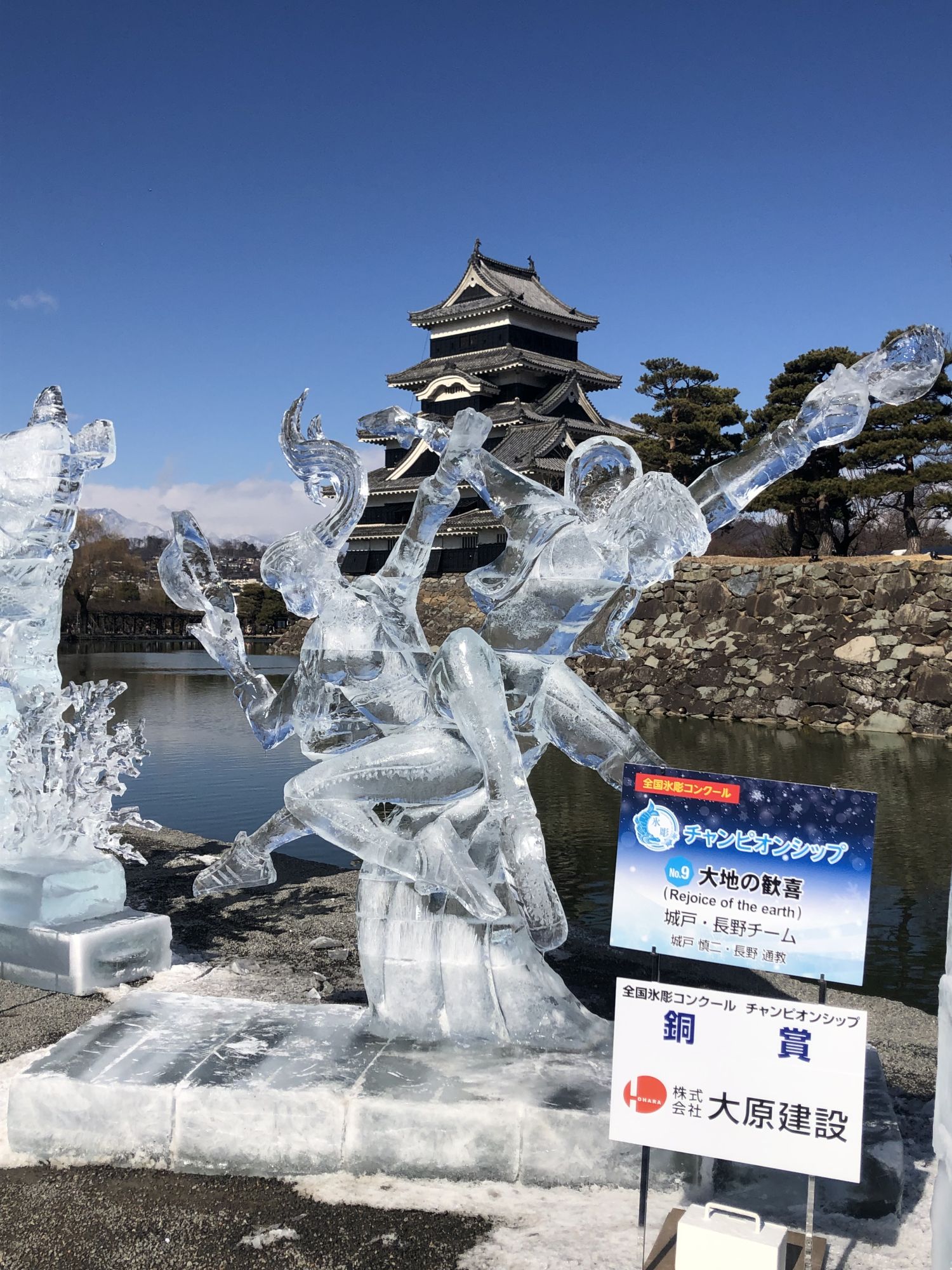 一年一度的松本城冰雕节 周日, 1月 29, 2023 ♥24 一年一度的松本城冰雕节(2023年1月27至29日),早已成为信州冬季的风物志。虽然正值数九寒冬,幸运的是这两天天气由阴转晴,蔚蓝的天空下,远处的阿尔比斯山、耸立的日本国宝城楼、精湛的冰雕作品,似乎在向人们诉说着冰雪的豪情。 让我们去观赏一下几处获奖作品: 还有其它两处的冰雕:一处是四柱神社前 另一处是在中街的古酿酒店前 虽然已经听到了春的脚步声,但沉浸在这奇特的冰雪世界中,对冬的使者们还真有点儿留恋不舍的感觉。 Tweet