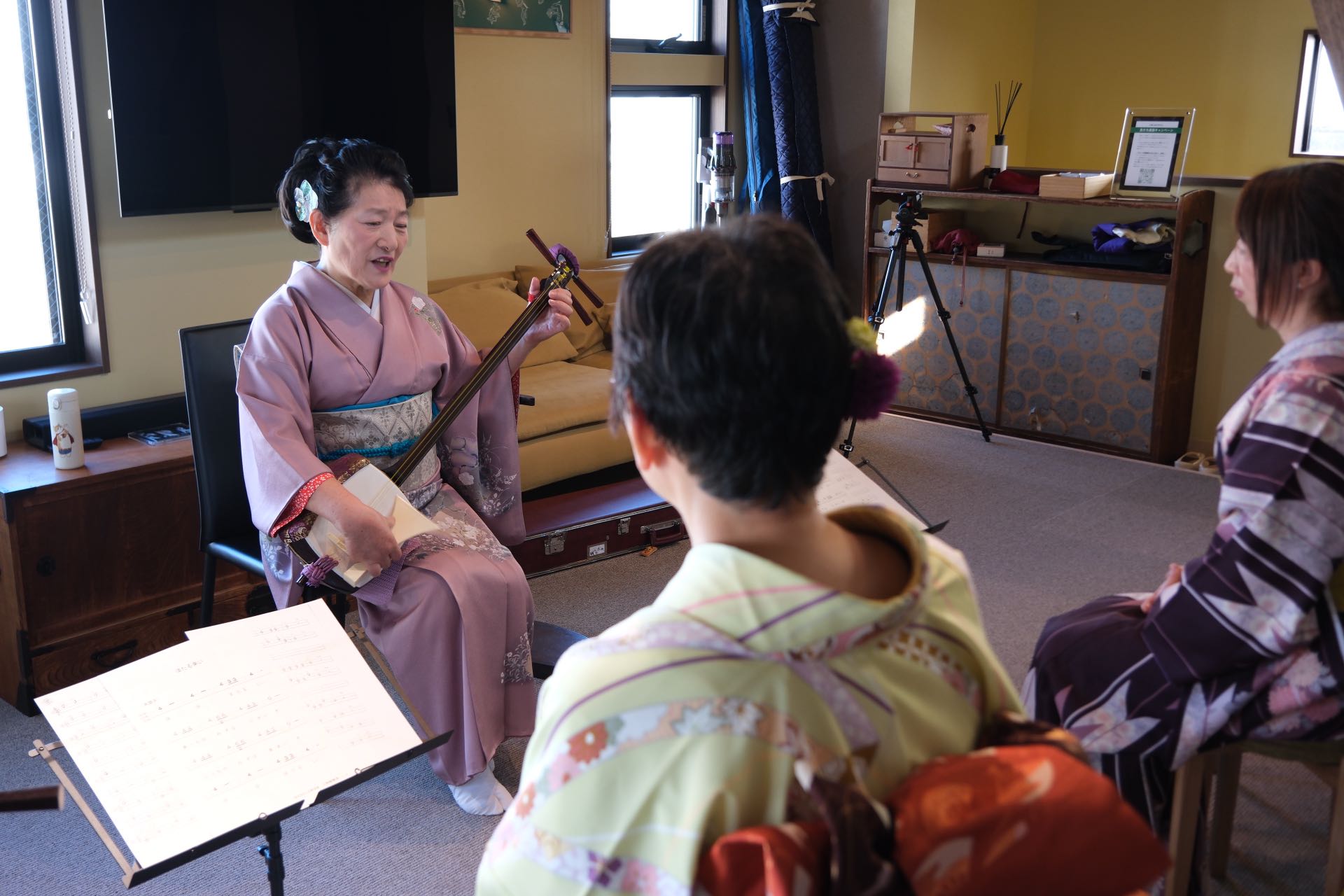 三味线是一种三弦乐器,看似简单,但顾得了拨弦的右手,就顾不了变音高的左手,真是不易!教我们的老师叫山本扶美枝,是一位日本民谣歌手,能弹会唱,手把手地教我们。