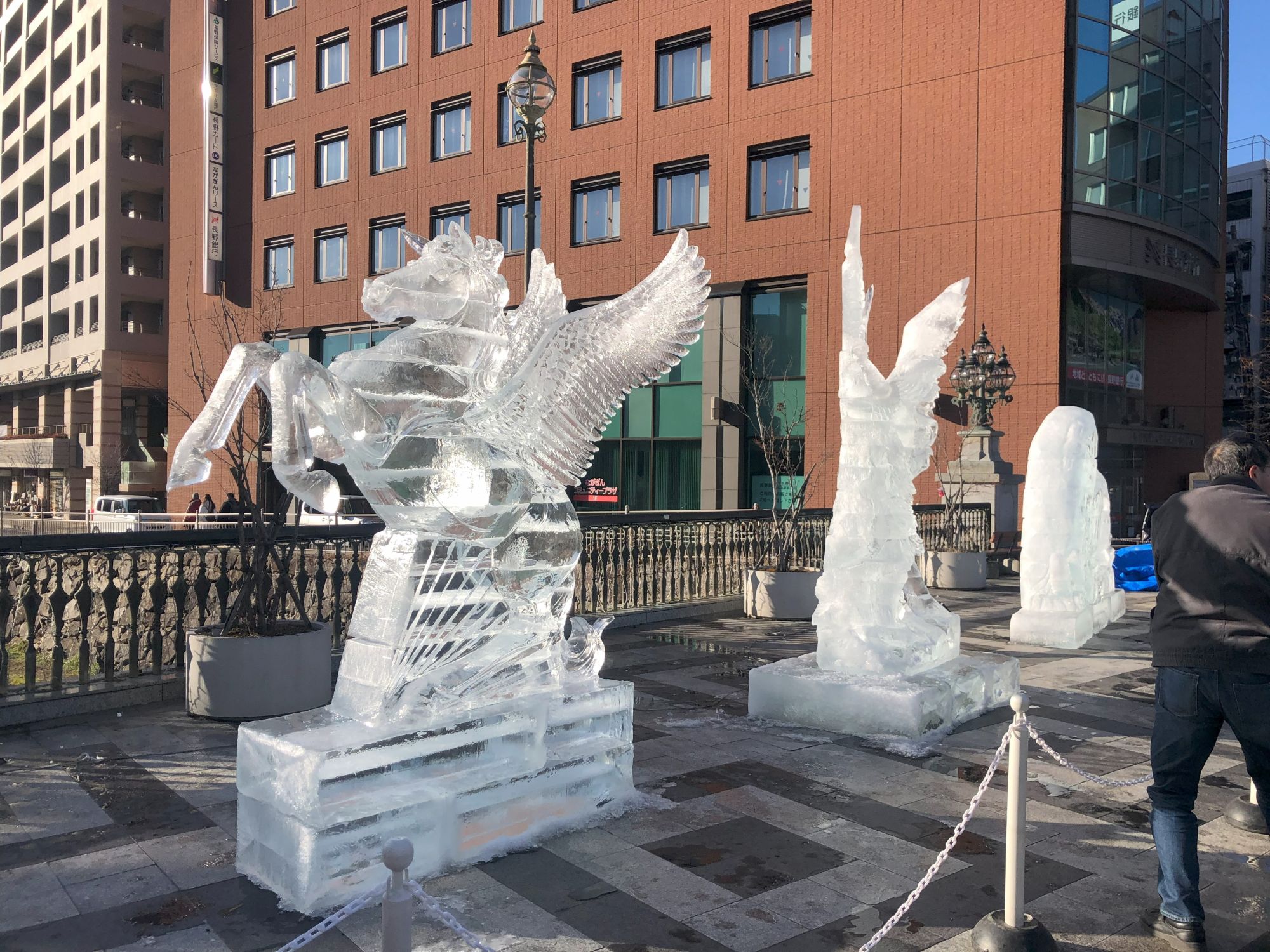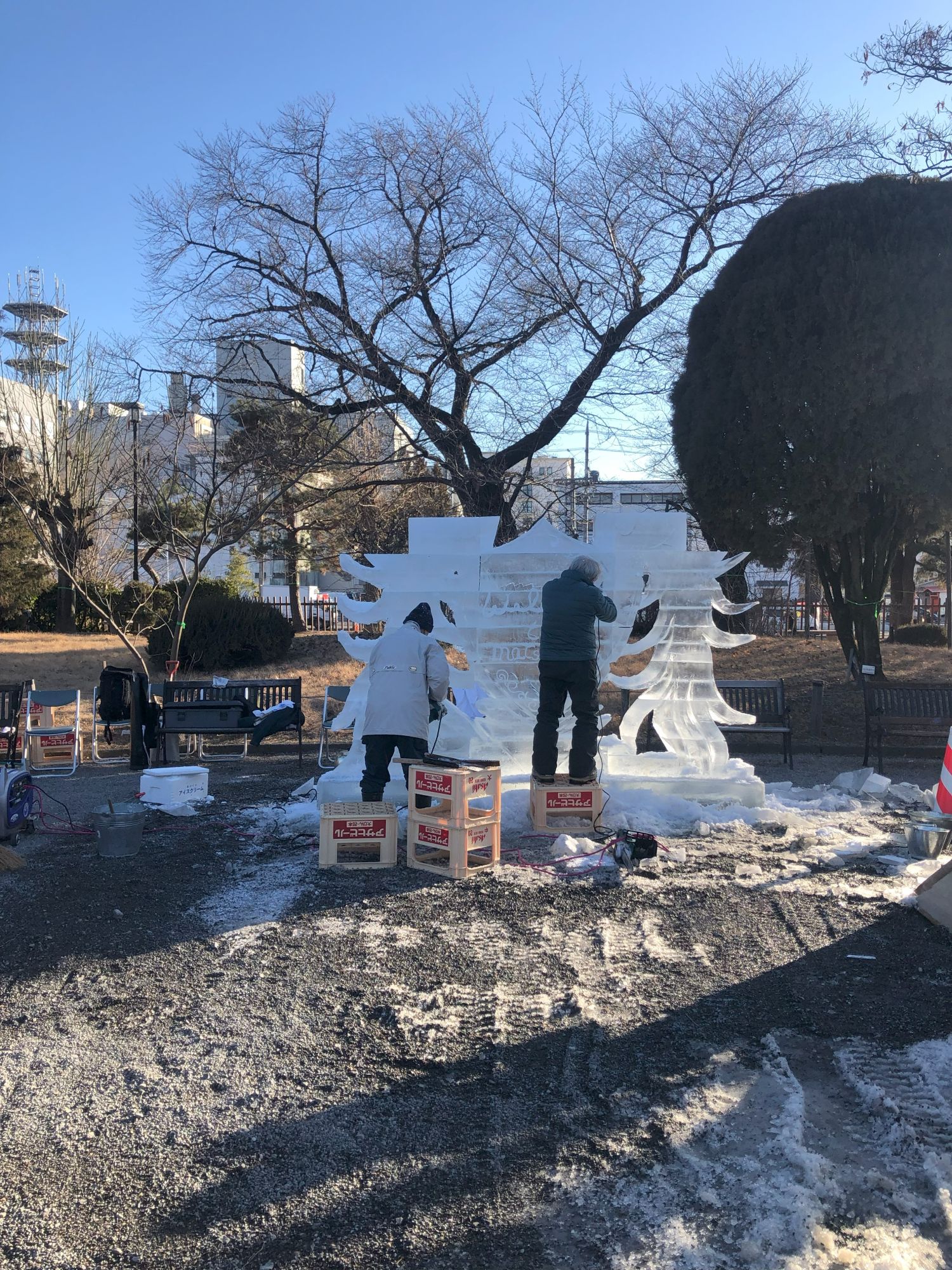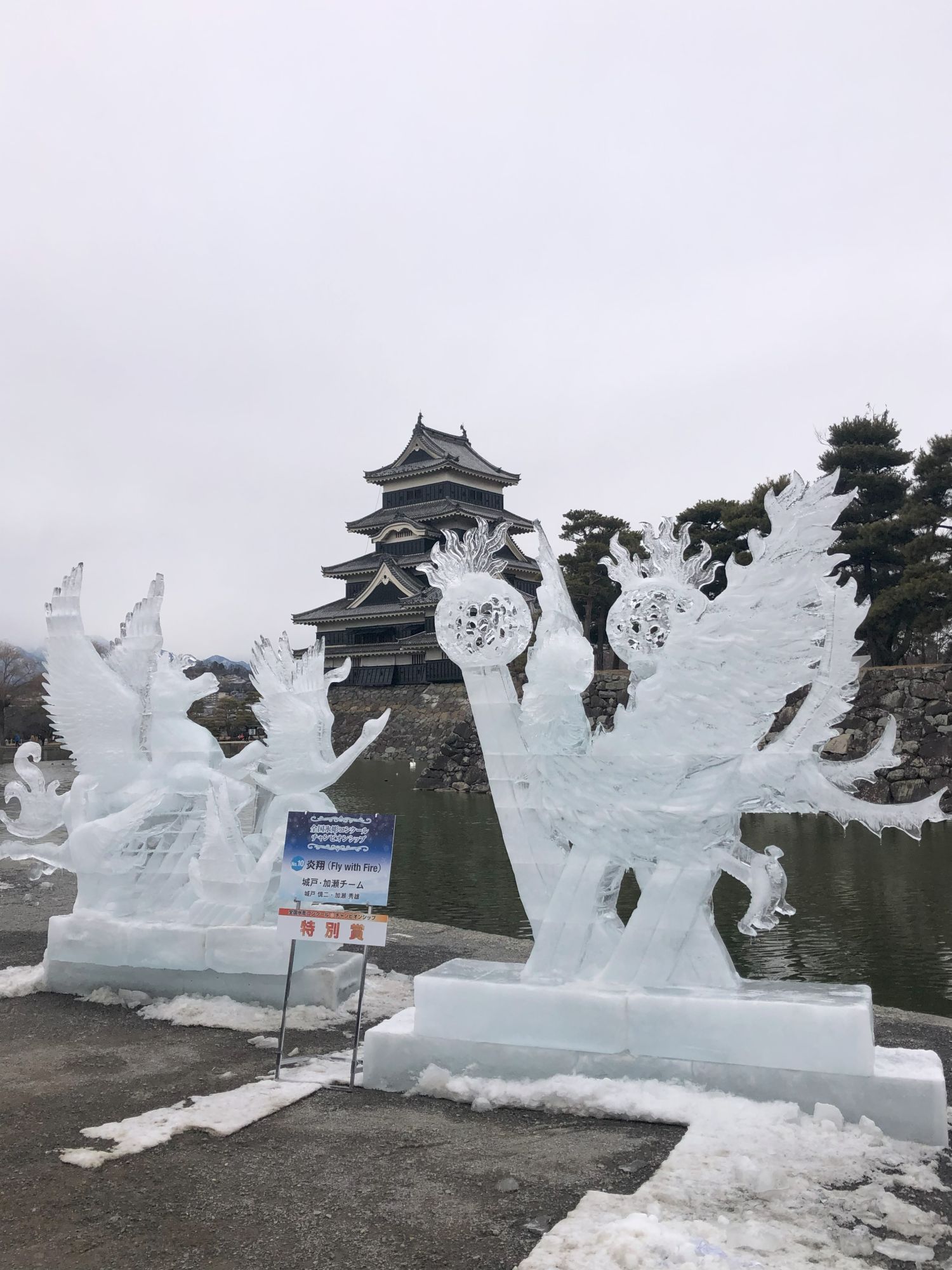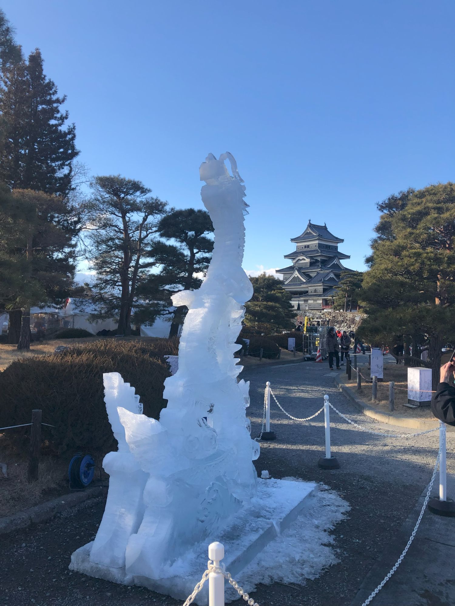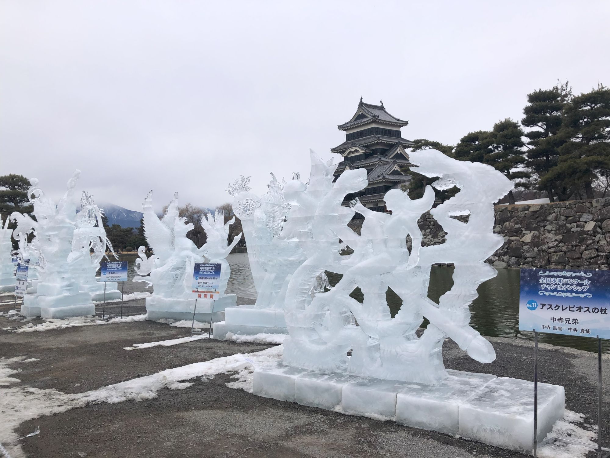 每年最低气温在零下10℃左右的一月底,松本都举办一个制作和展示冰雕艺术的活动。其中最精彩的是在松本城举办的“冰雕节”,来自长野县内外的十几组冰雕艺术家,将在寒冷的天气中整夜努力,使用冰雕刻出作品并参加竞赛。制作完成的冰雕在松本城的户外展出。