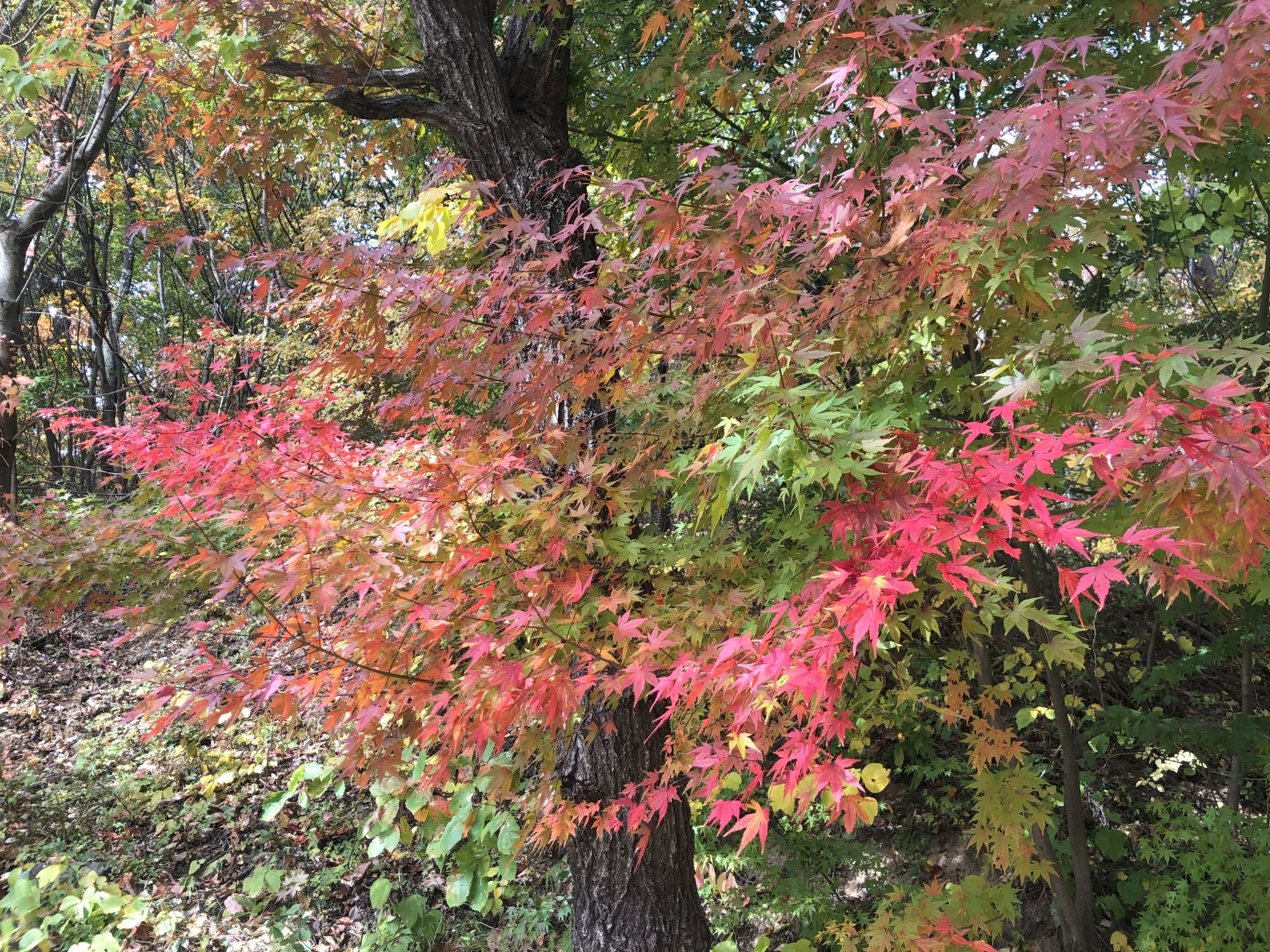 再往里走,又有这样的一树数色!在告诉我们是这样地一叶一叶渐渐变红的
