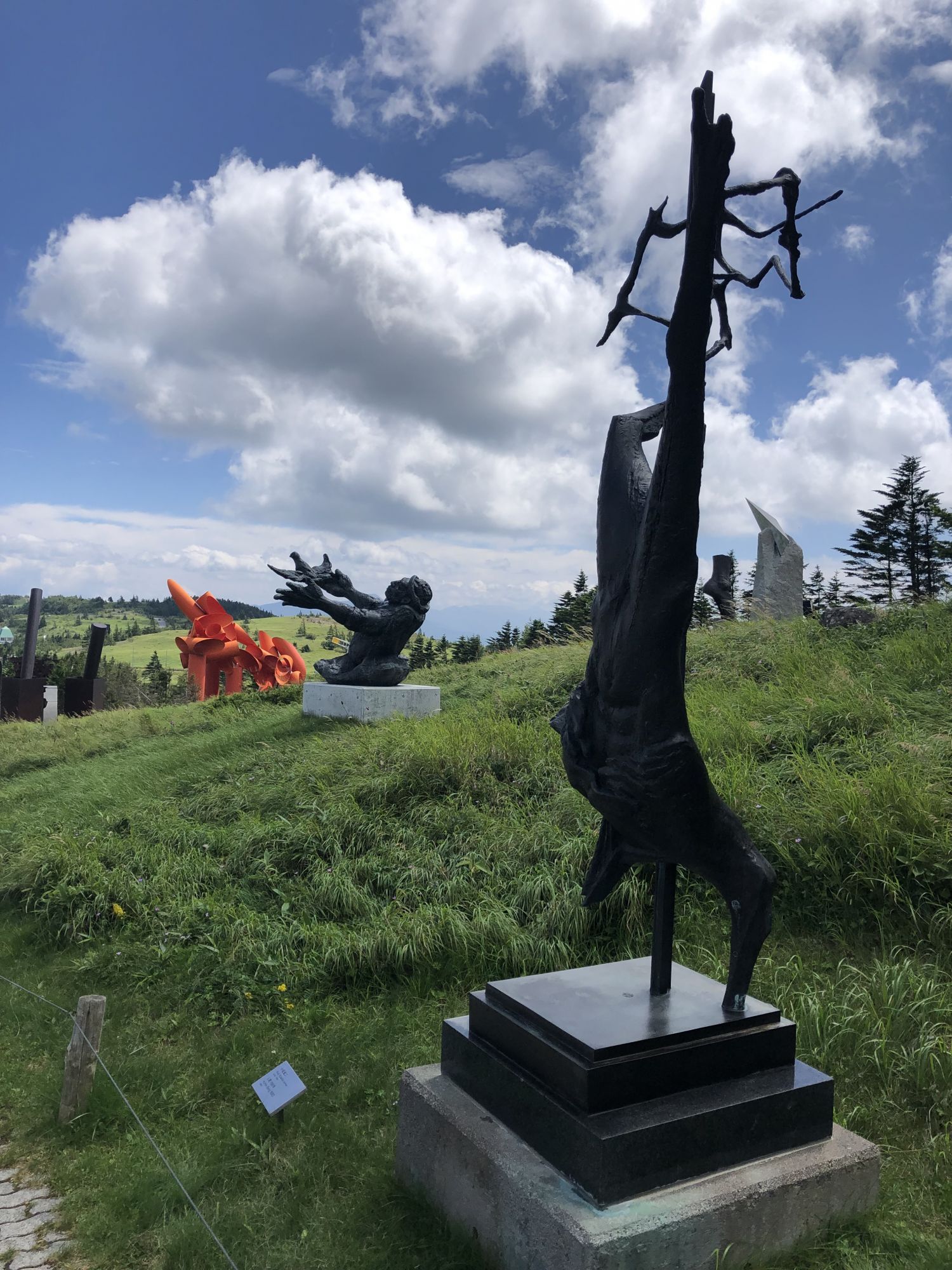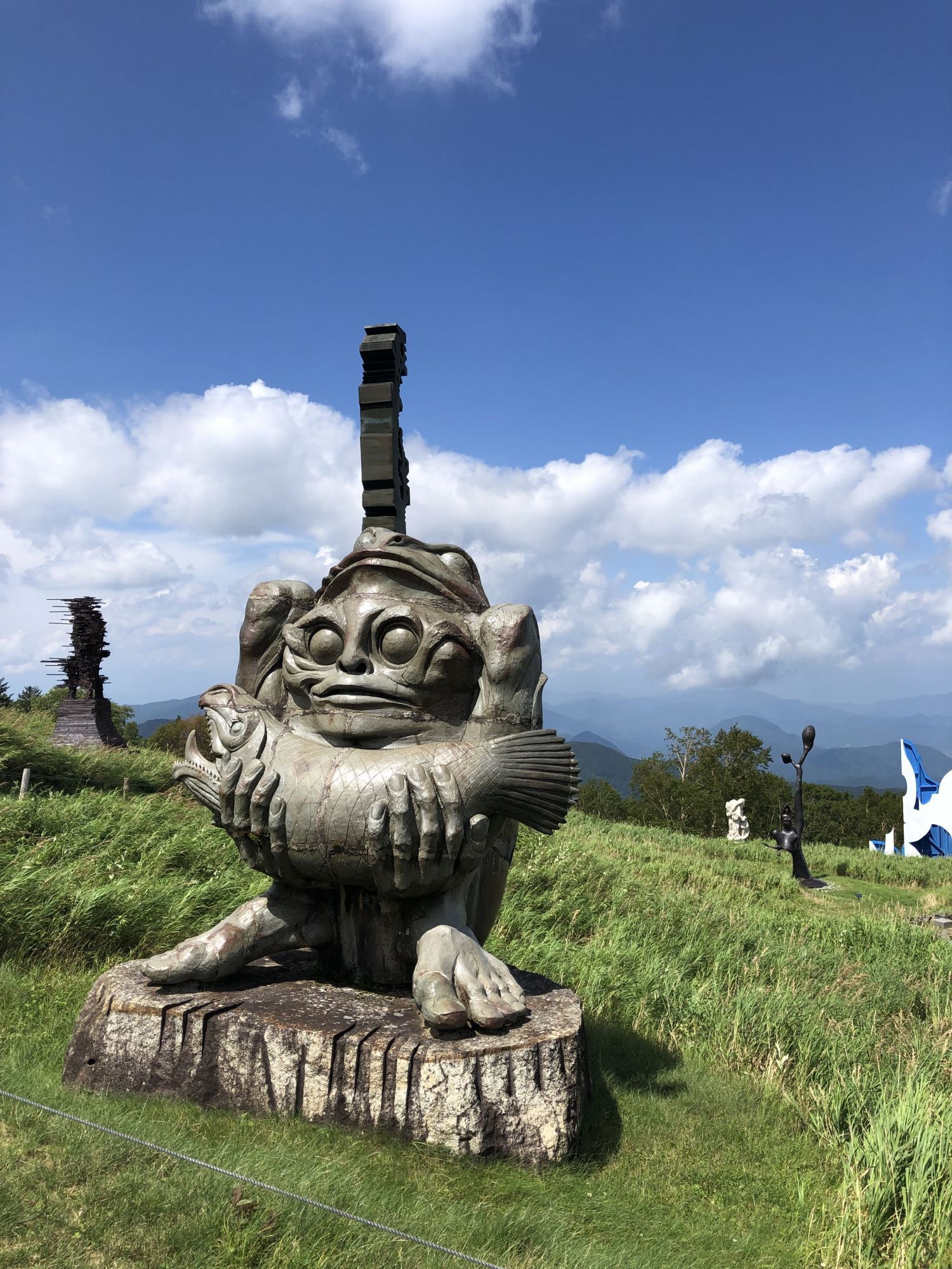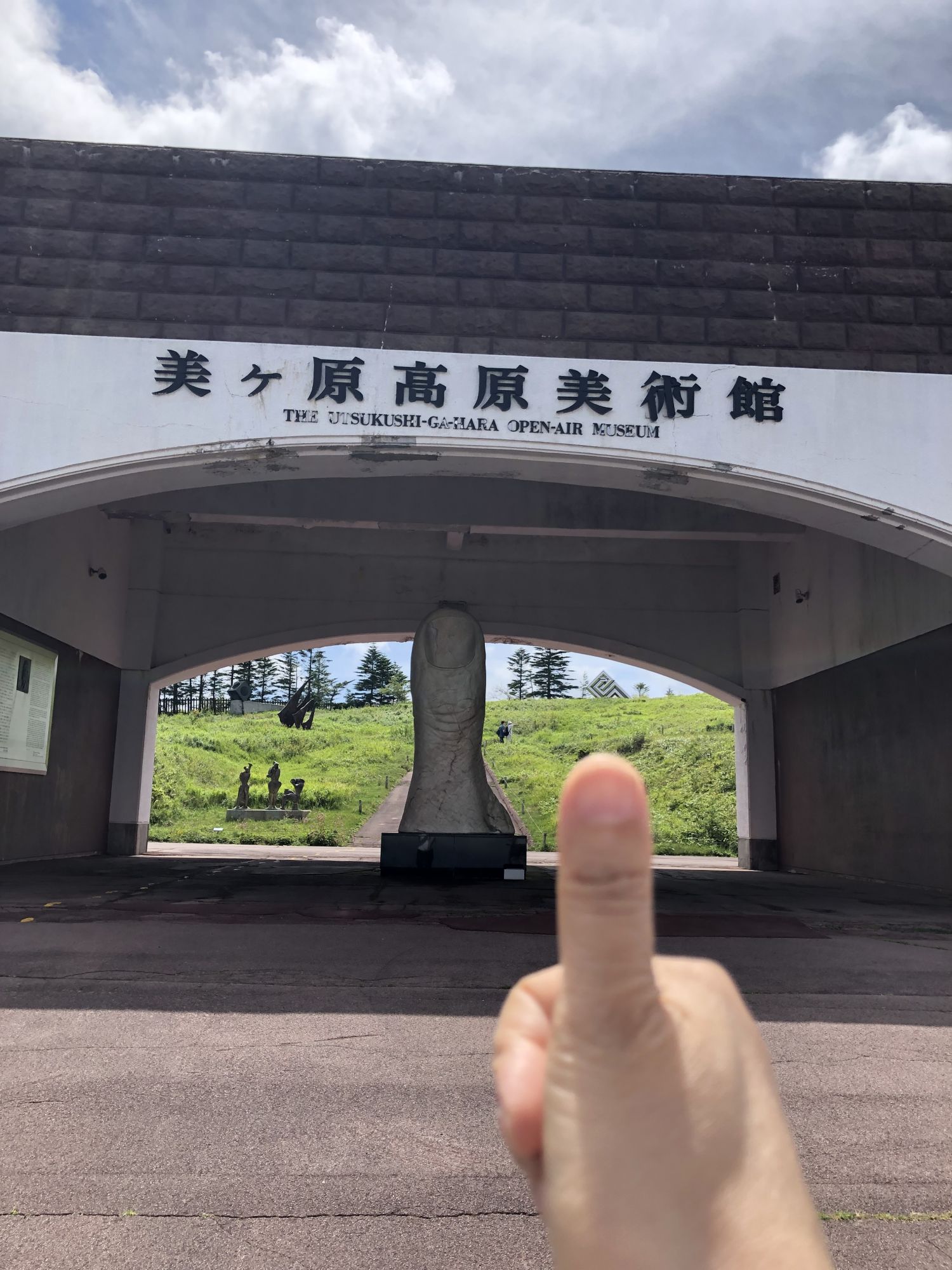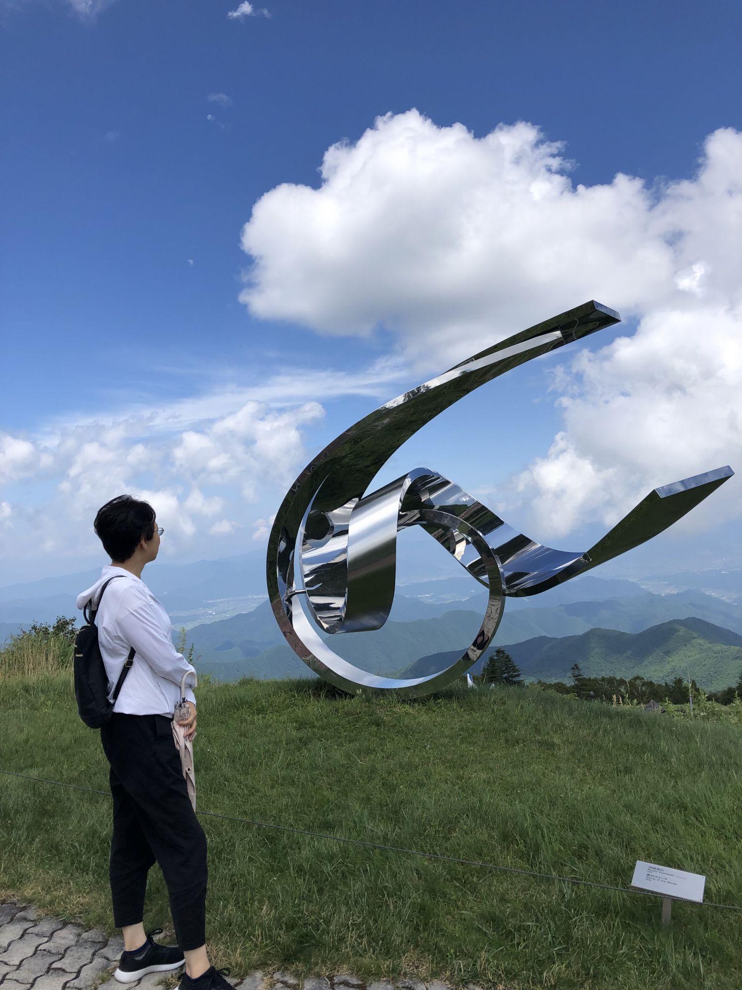 美原高原露天美术馆 其他 周五, 8月 30, 2019 ♥47 前几天,陪从国内来自由行的老同学,从松本市内开车去了美原高原。山下30多度,很是闷热。可到了海拔2000米的山上, 被凉爽的清风吹得不得不多添了件外衣。高原有牧场、电波塔,可远眺脚下起伏的山峦。但更值得推荐的是这野外雕塑博物馆。 作品名:大拇指 作品名:进化亲戚 作品名:风之摇 海拔2000米处的山峦 红与蓝的穿梭 美术作品 美术作品 美术作品 牧场的信州牛 还有许多雕塑作品,请参考博物馆网页https://www.utsukushi-oam.jp Tweet