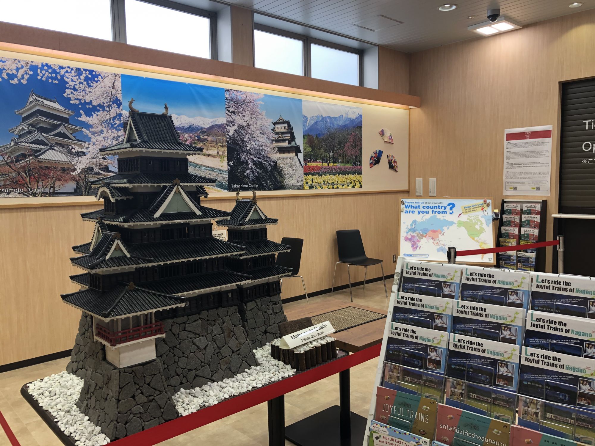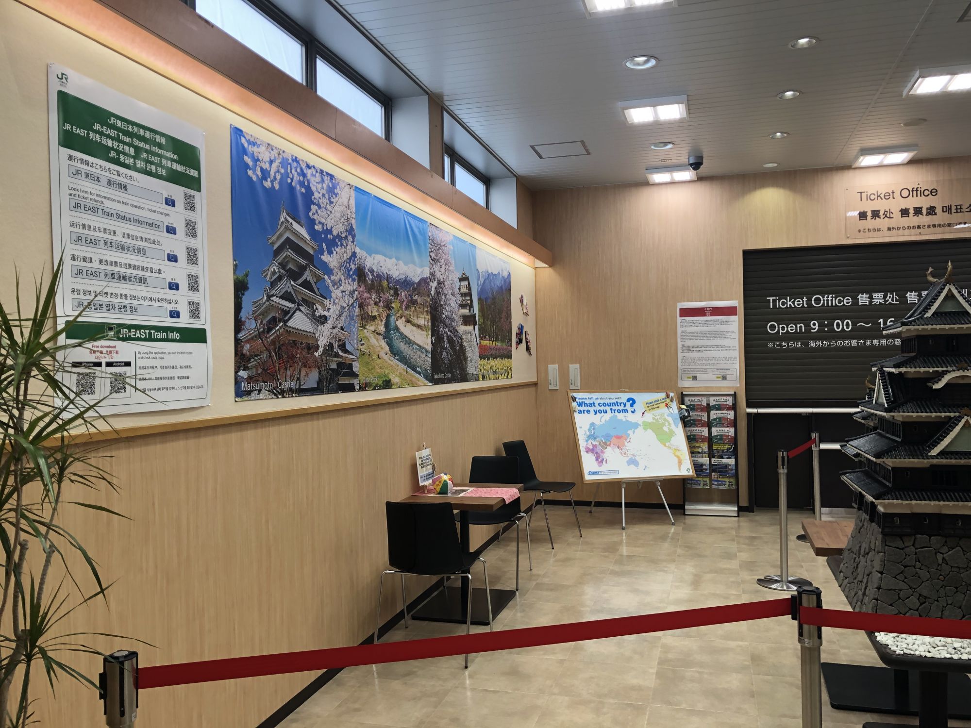 松本站,新建有专为海外游客的窗口、休息室、咨询处。还有介绍当地特产的橱窗。