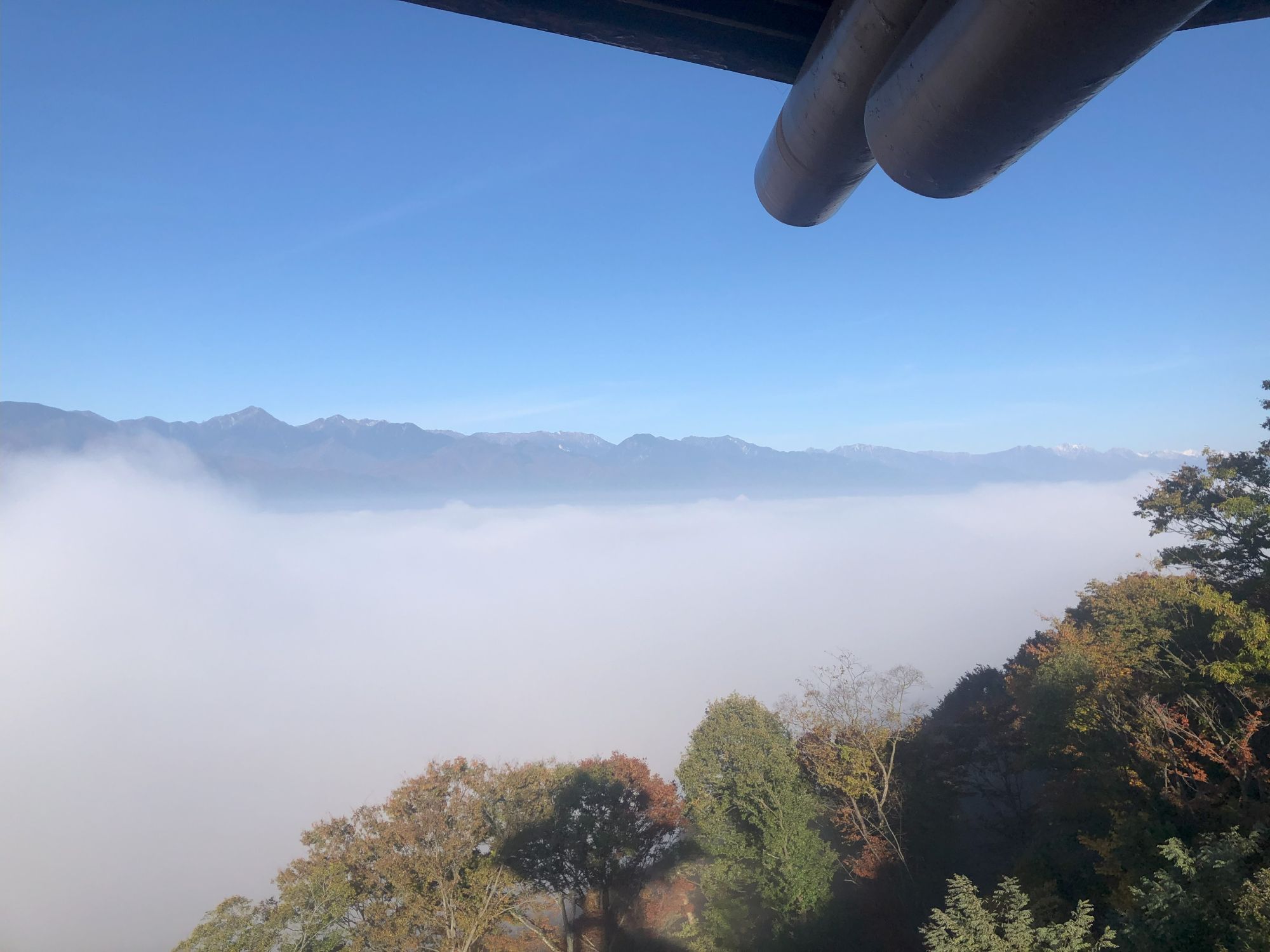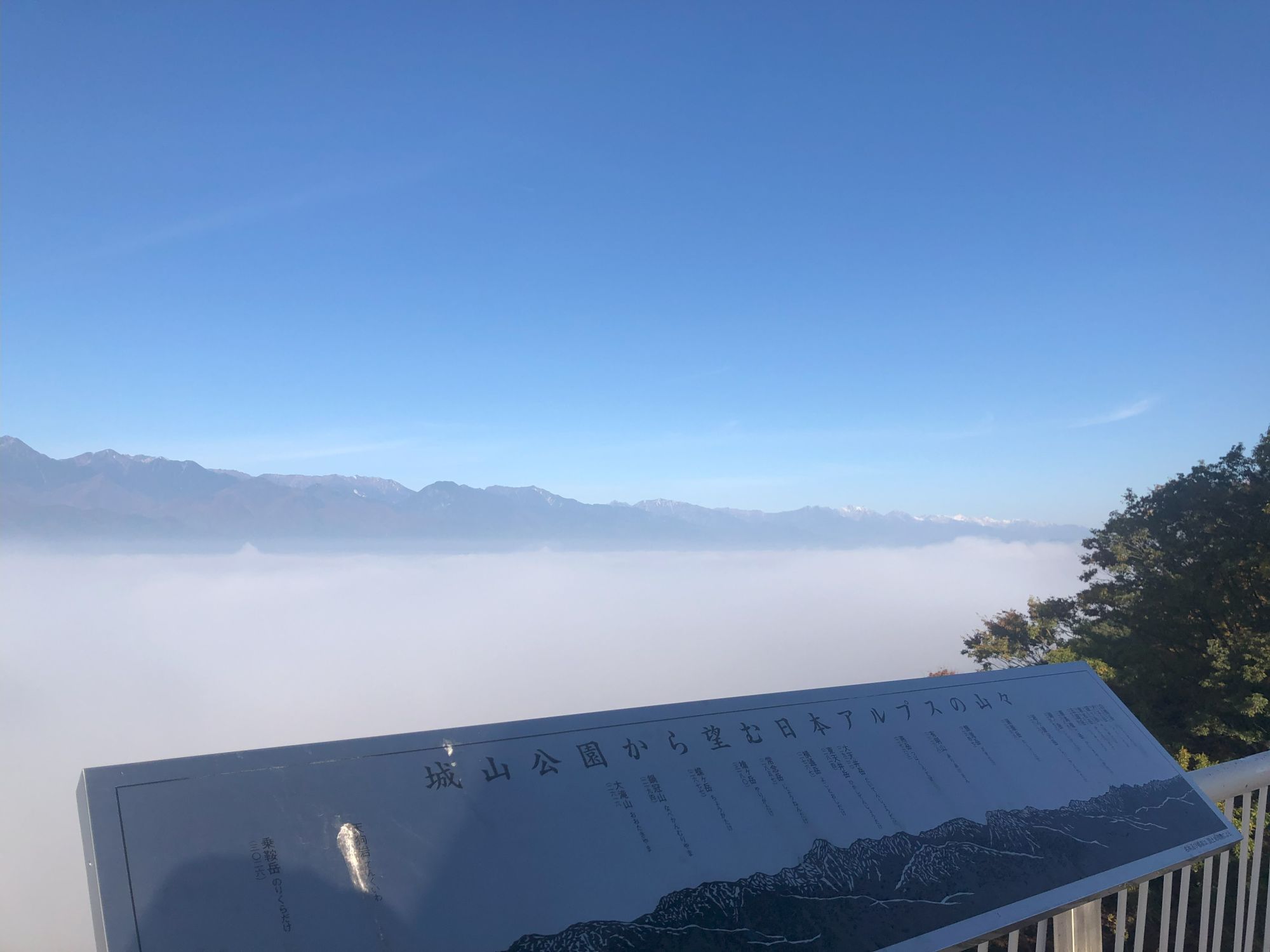 松本市内看云海之处(其二):城山公园 自然 / 季节信息 / 观光 周二, 12月 17, 2024 ♥15 今天再来介绍一处松本市内能看到云海的公园,也是赏樱花著称的城山公园。十一月底的清晨一大早,开车到公园。从眺望台上看去,已是白茫茫一片。 这张事后才发现自己的影子处,居然拍到了像佛光一样的反射光,有点儿神奇! 走下眺望台,公园内也似仙境般,云雾绕绕 还有这红红的秋色 Tweet