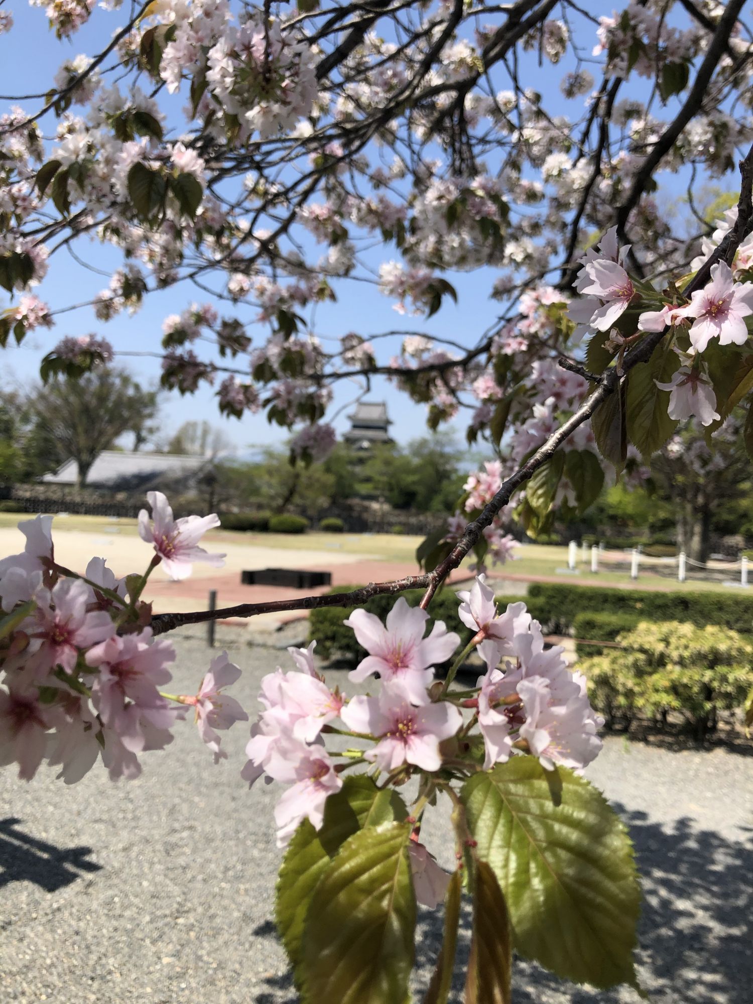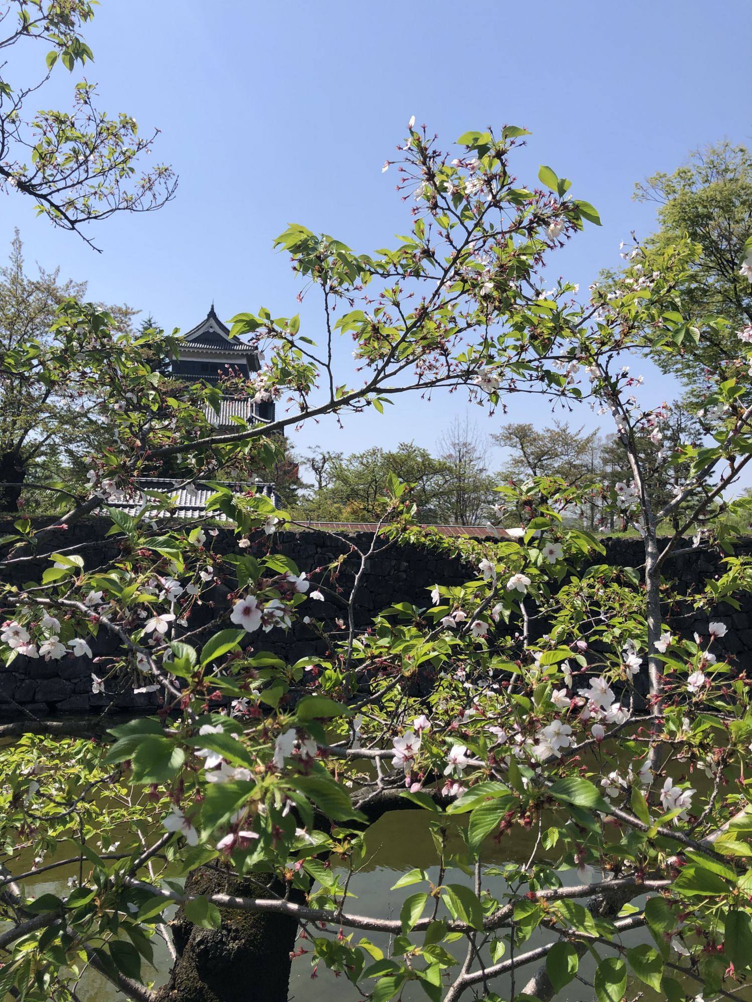 五月初,正值信州春意正浓之际。衬着雪山、蓝天下的樱花还在绽放。