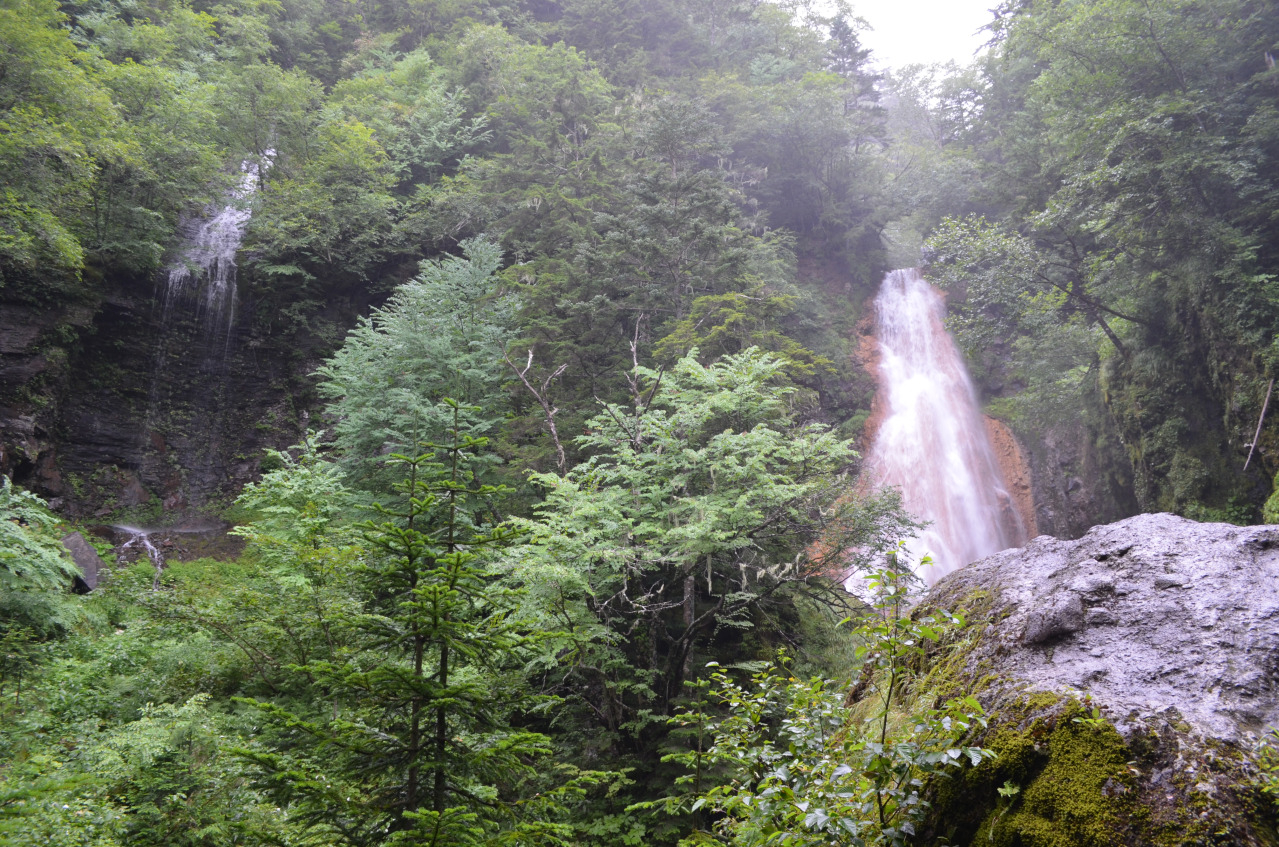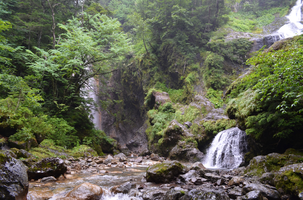 位於乘鞍岳山麓、海拔約1,800公尺的森林中的一處瀑布。三條水源各異的山溪在此匯流而下,形成可同時眺望三道瀑布的罕見景觀。各瀑布落差約50至60公尺,水流沿岩壁奔瀉而下的姿態各具特色。此處不僅是長野縣的名勝,更獲選為「日本百大瀑布」之一。這是一處需沿步道步行前往的景點,亦是乘鞍高原最具代表性的景勝地之一。